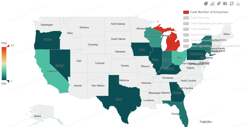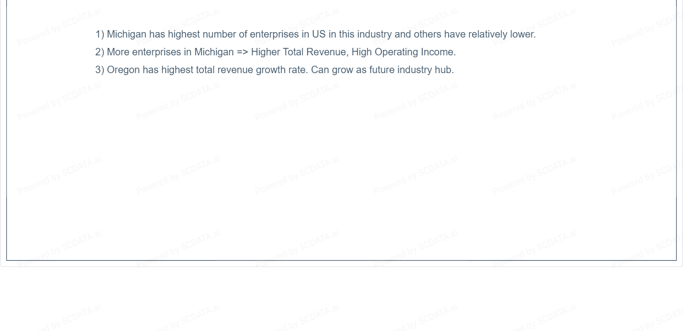 1) Michigan has highest number of enterprises in US in this industry and others have relatively lower.