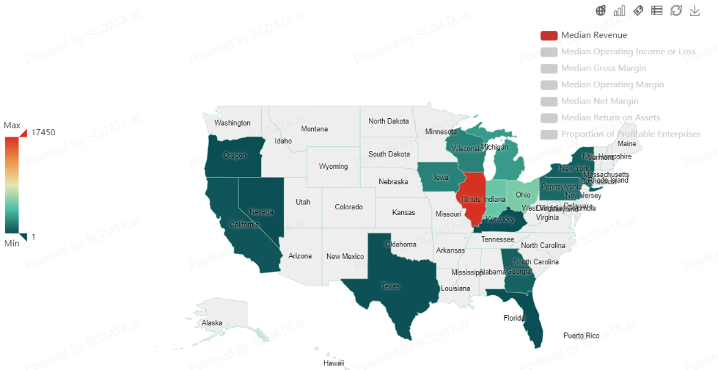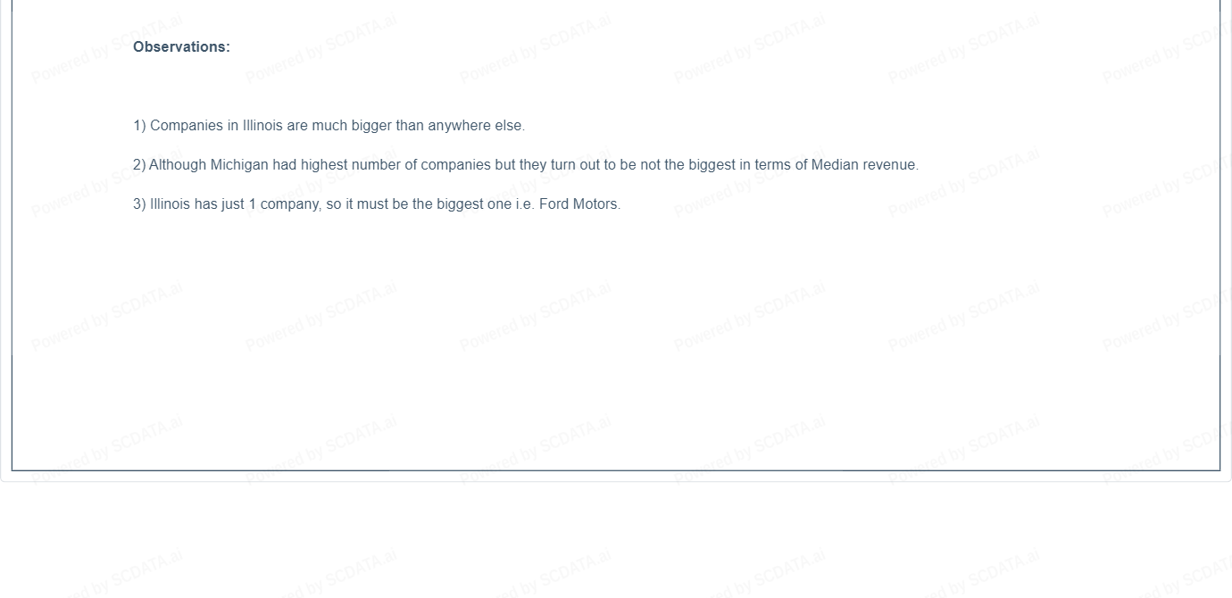 2) Although Michigan had highest number of companies but they turn out to be not the biggest in terms of Median revenue.