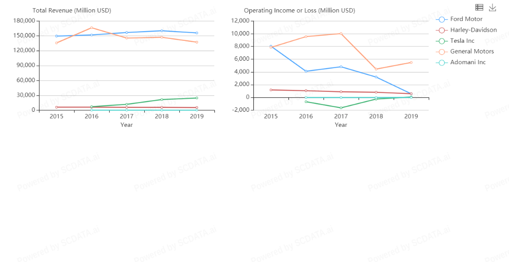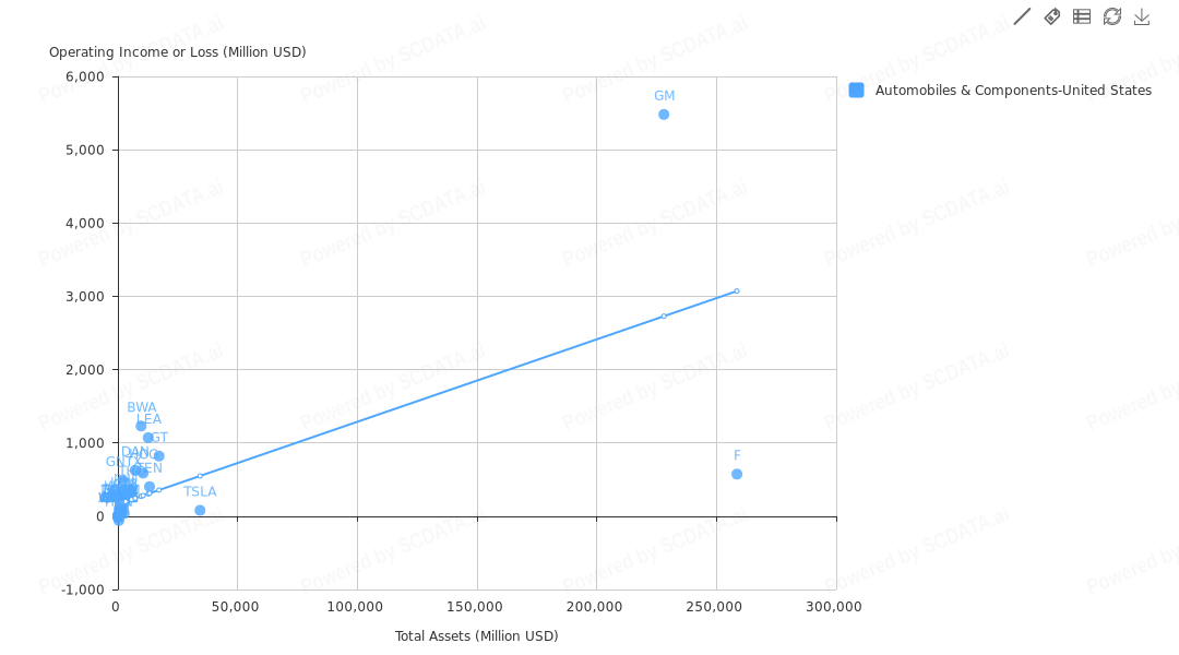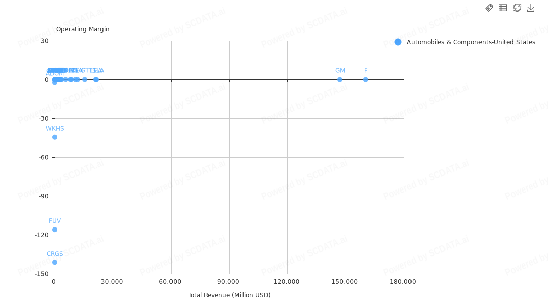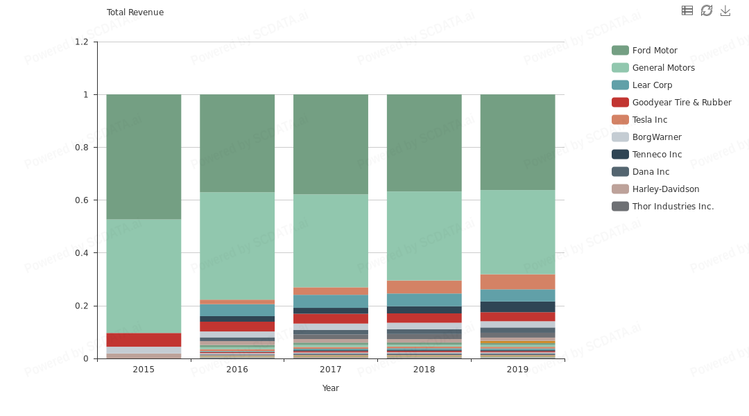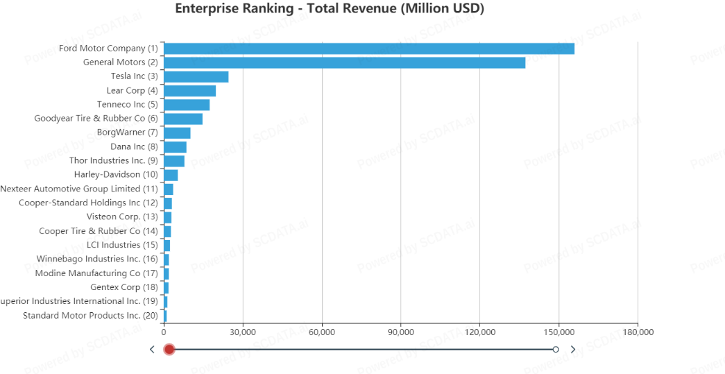 Majority of the companies have total revenue below 20,000 Million USD with only three big players i.e. Ford, GM and Tesla