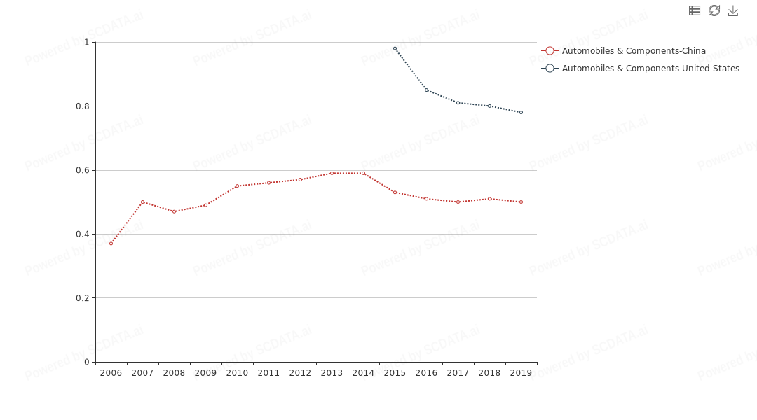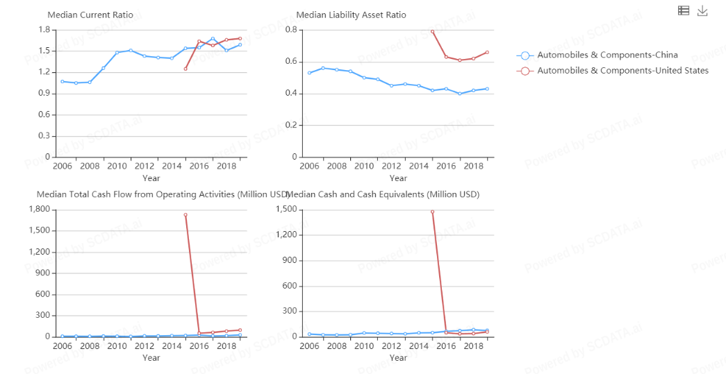 1) China has similar Current Ratio but better L-A ratio than US. The lower the debt to asset ratio, the less risky the company. Also, total cash flow is similar in Automobile industry for both in recent years.