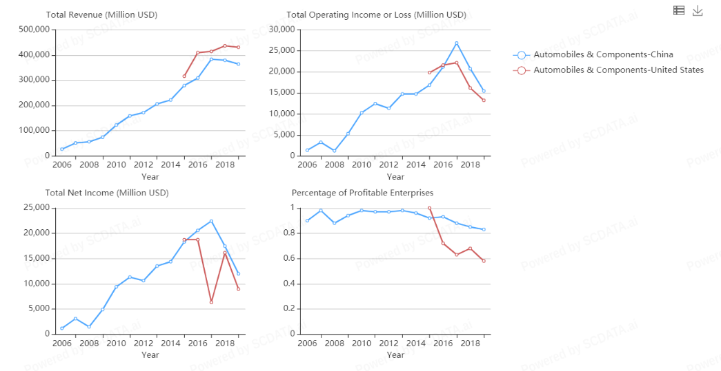 1) US leads in total revenue but lags behind China in Total operating Income and Percentage of profitable enterprises.