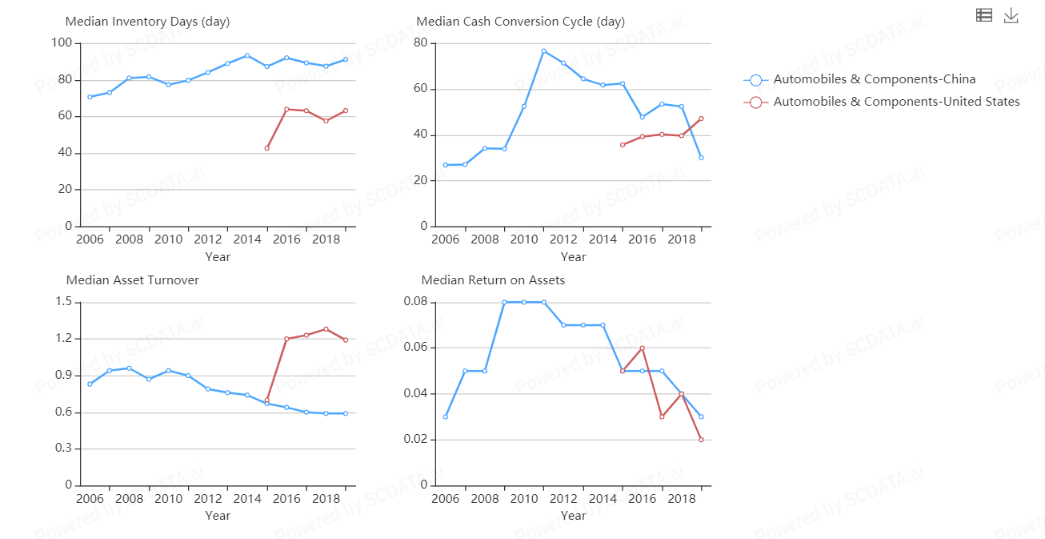 US has much higher Asset turnover wrt China => US has better utilization of their assets such as vehicles and facilities. Also, US has lower Inventory days.
