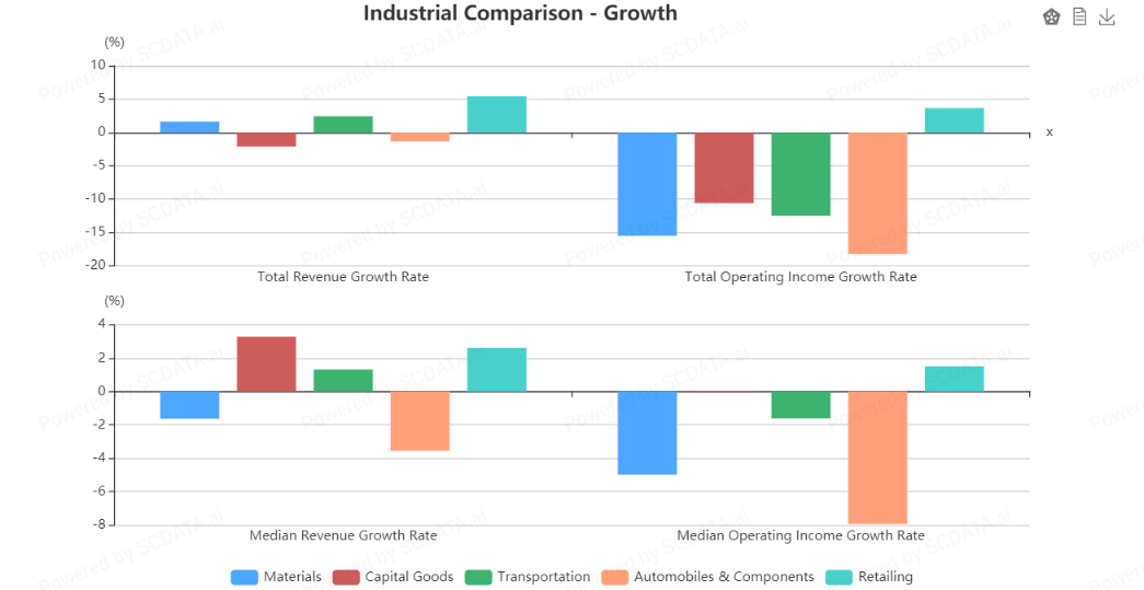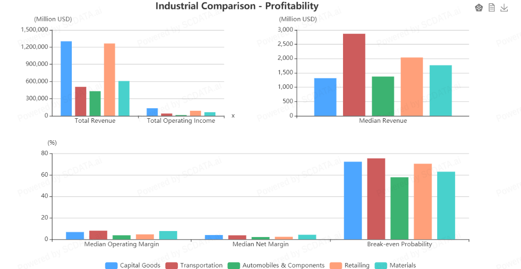 Retailing and Capital goods has higher total revenue whereas Transportation has highest median revenue. Also, net margin is quite similar for all but break even probability for other 4 is better than Automobile industry.