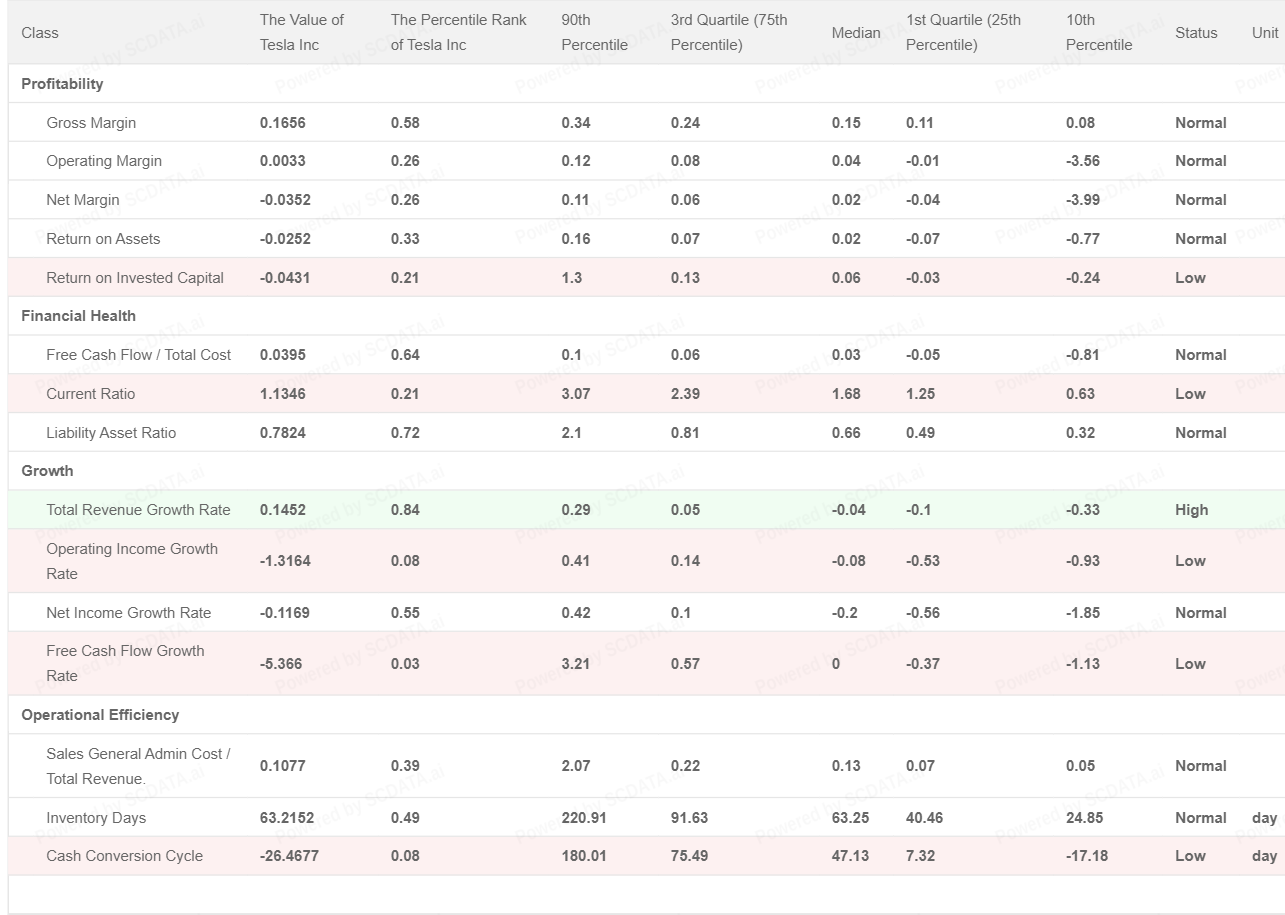 Tesla Inc is average performer in profitability, gross margin an current ratio.
