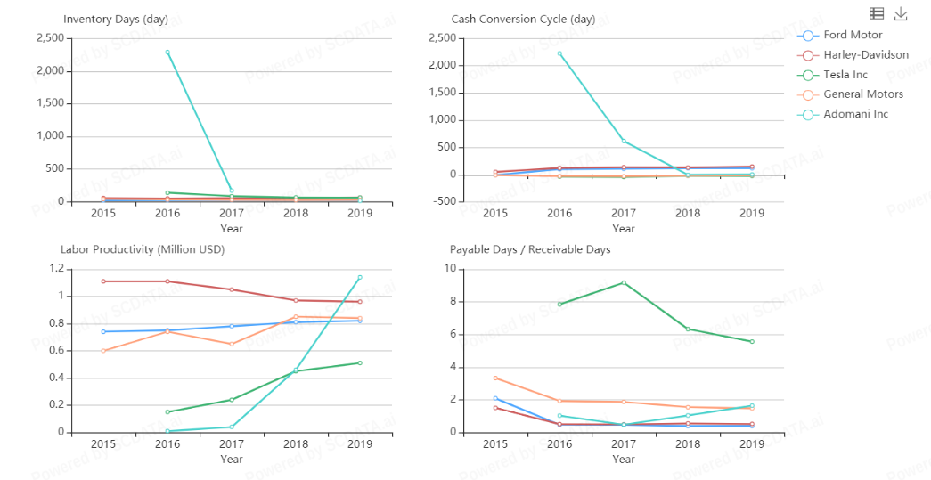 Tesla has poor labor productivity, lowest in recent years. But, has amazing bargaining power over its suppliers and customers with highest payable over receivable days ratio.