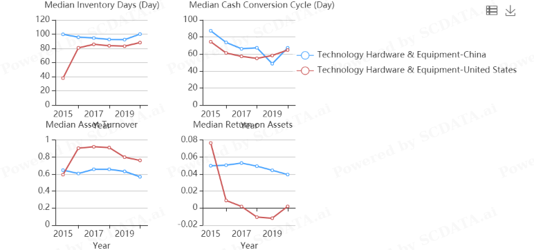 Except for 2015, inventory days in the U.S. and China maintained the same trend in all years. Inventory days, which are higher in China than in the U.S. prove that the Chinese companies involved need to keep longer inventories of hardware equipment and are less efficient than U.S. companies. The shorter the cash conversion cycle, the better. The U.S. has fewer CCCs than China, so U.S. companies have faster cash turns. However, the U.S. CCC growth in 2020 is close to China's. U.S. firms have higher asset turnover rates, indicating that U.S. firms utilize assets more quickly and efficiently to move from input to output. China is better than the U.S. in ROA. The ROA of Chinese companies has always remained around 0.04 to 0.05. While US companies have a more volatile ROA and even a negative ROA in 2018 and 2019. Chinese companies have a better ability to generate turnover from their assets than U.S. companies.