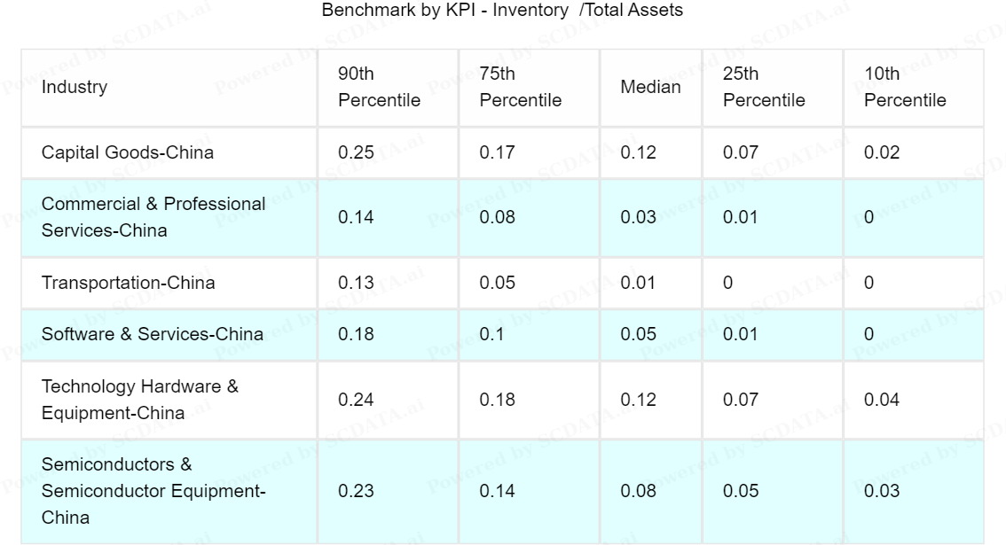 The situation in China is similar to that in the United States. The page is Industrials and Information Technology's Level-2 Industrials in China. Among the six industries's median Inventory / Total Assets, Technology Hardware & Equipment and Capital Goods still occupy the top 2, but they do not differ in the median in China. Inventory in assets is low in service-related industries, such as Commerical & Professional Services, Software & Services, and Transportation.