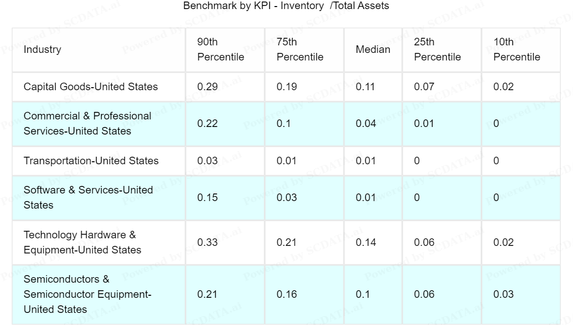 I choose Capital Goods and Technology Hardware & Equiprment as the two industies to analysis, and the level 1 iare Industrials and Information Technology. Thus, the page is Industrials and Information Technology's Level-2 Industrials in US. Among the six industries's median Inventory / Total Assets, Technology Hardware & Equipment and Capital Goods occupy the first and second with 0.14 and 0.11 respectively, followed by Semiconductors and Semiconductor equipment. The ratio is 0.04 for Commerical & Professional Services and the ratio is 0.01 for both Software & Services and Transportation.
