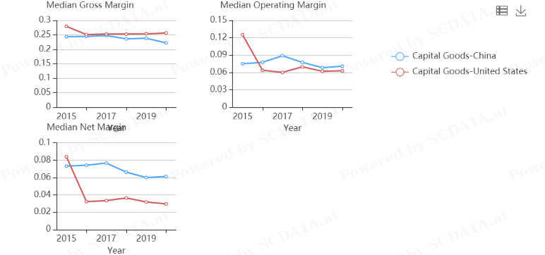 In the Capital Goods industry, the difference between the U.S. and China is smaller in total interest rates and operating margins, but net interest rates are nearly twice as high in China as in the U.S., indicating that U.S. companies spend more on non-operating and other activities.