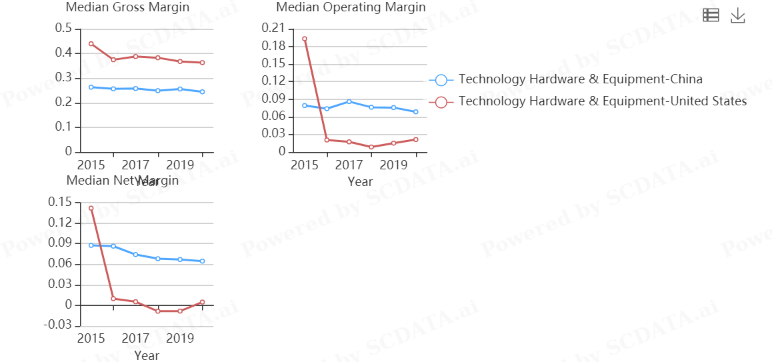 In the Technology Hardware & Equipment industry, the gap between Chinese and American companies is bigger than capital goods. The total profit margin in the U.S. is higher than that in China, yet the operating margin is lower than that in China, indicating that U.S. companies spend less on product costs and more on daily operations. The U.S. net profit margin is not promising, hovering around 0, while China's is higher than 0.06, probably because the U.S. spends on non-operating activities, such as taxes. Overall, U.S. companies are less profitable than China.