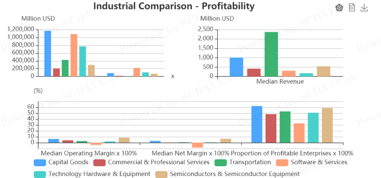 During the class, Professor Zhao analyzed the industry of Level-1, and I choose industrial and IT-related Level-2 industries to analysis. Among the six industries, the semiconductor industry has the highest operating profit margin as well as net profit margin, followed by capital goods. The operating margin as well as the net profit margin for software and services are both negative, indicating the profitability of the industry.