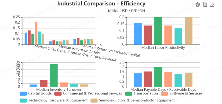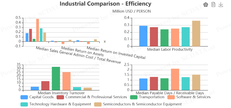 In the U.S., in addition to high inventory turnover in Transportation, Software & Services also have higher turnover rates. Labor productivity is also much lower compared to the Level-1 industries that Professor Zhao compared in class. All six industries have higher days payable than days receivable, with software and services having the best debt turnover. The return on investment for these six industries in the U.S. is lower than in China, with the Software & Services industry having a negative return on assets, evidence of negative net profits and a weaker ability to use assets to generate profits.