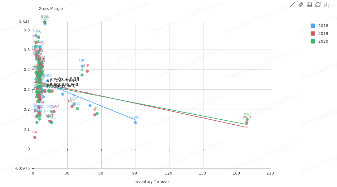 The number of Technology Hardware & Equiprment companies in China is even greater than in the United States, so the relationship is not obvious. As inventory turns increase, there is a slight decrease in gross margin, which is more pronounced in 2018.