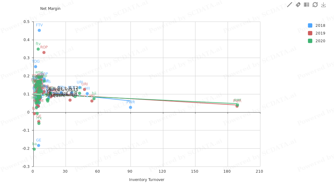Due to the large sample size, the total profitability of most firms with capital goods is concentrated in six inventory turns a year. However, from the straight line formed by the function, we can determine that the total profitability is related to the inventory turnover. As the inventory turnover increases, the total profitability decreases.