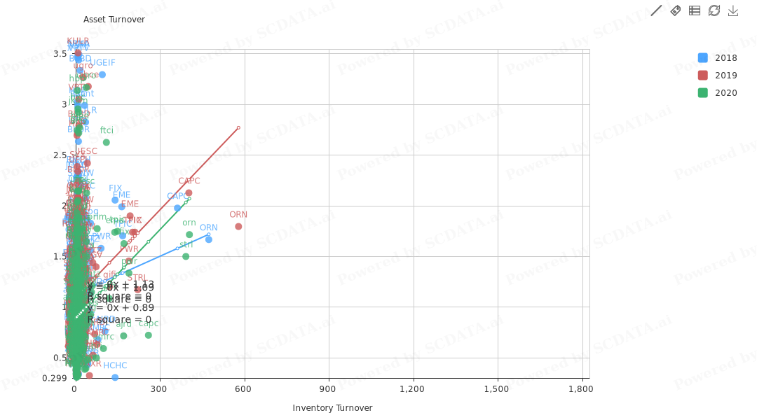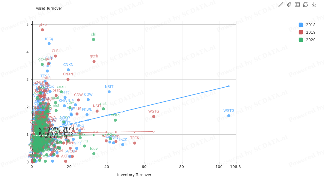 In 2018, inventory turnover has a significant positive relationship with asset turnover, probably because inventory itself is an asset and the turnover of inventory drives the turnover of assets. However, in 2019 and 2020, this relationship does not manifest itself.