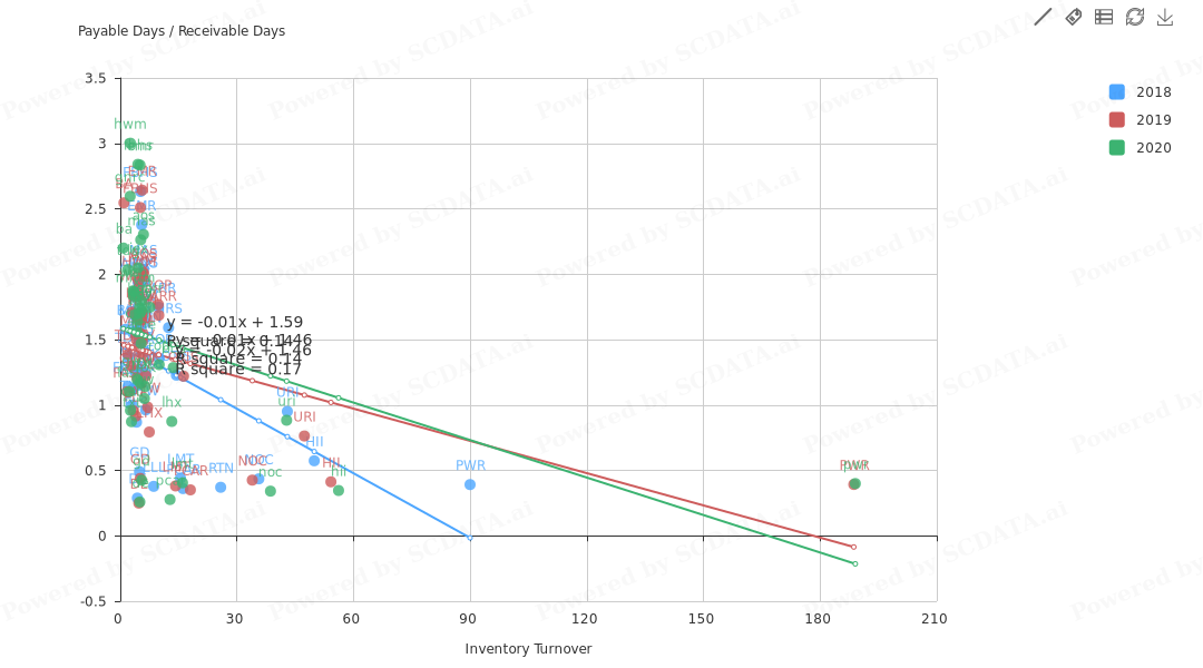 In 2019, there is a strong linear relationship between Payable Days / Receivable Days and inventory turns for Chinese companies, i.e. Payable Days / Receivable Days increases rapidly with the increase in inventory turns. In 2018 and 2020, the trend of this increase is very flat. Unlike Payable Days / Receivable Days in the U.S., which increase with inventory turnover, the possible reason for this change in China is that there is not a strong link between collections and payments and deliveries.