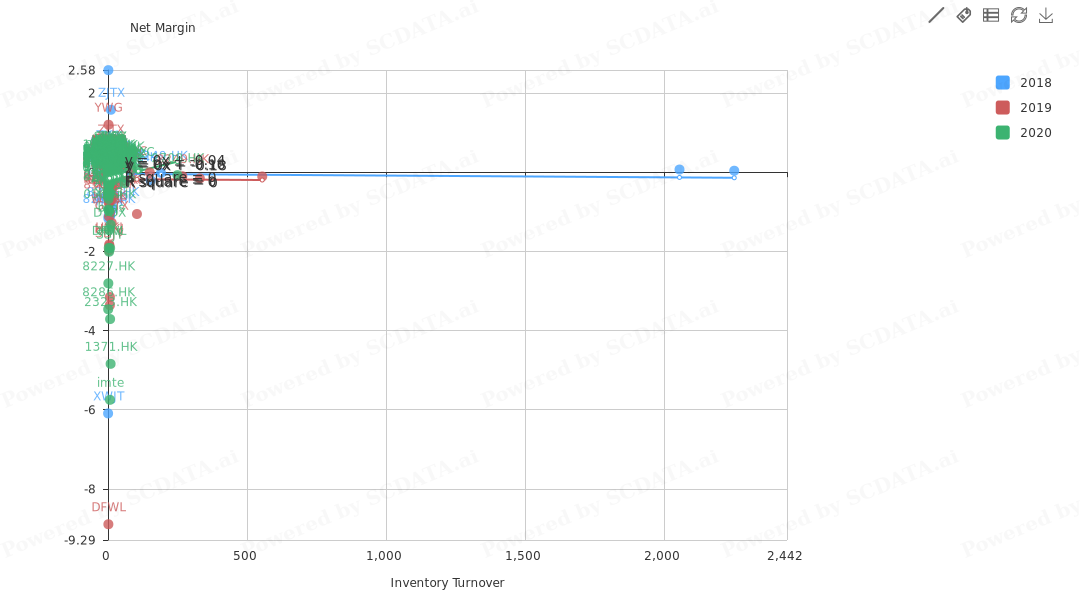 From the graph, the straight line formed by net margin and inventory turnover is extremely flat and the correlation coefficient is 0. Therefore, the correlation between inventory turnover and net profit margin is extremely weak in Technology Hardware & Equiprment, China.