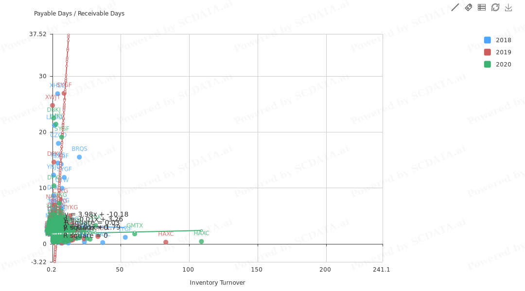 Although the data volume remains large, the correlation coefficient is not zero this time, indicating a strong relationship between inventory turnover and Payable Days / Receivable Days. With the increase in inventory, Payable Days / Receivable Days derease. Faster inventory turnover, faster receipt of goods by buyers, and thus faster payment shortens receivable days.