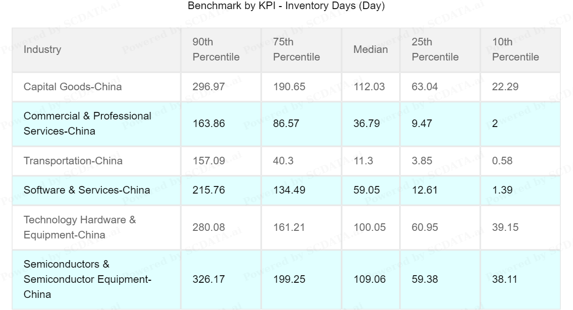 By comparing the median inventory days of Industrials and Information Technology's Level-2 Industrials in China, capital goods have the highest inventory days, followed by Semiconductors & Semiconductors Equipment and Technology Hardware & Equipment, respectively. I find that the service related industries will have less inventory, for example, the remaining three industries in the table are related to services, including the transportation industry due to its own characteristics therefore less inventory days.