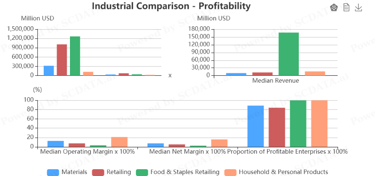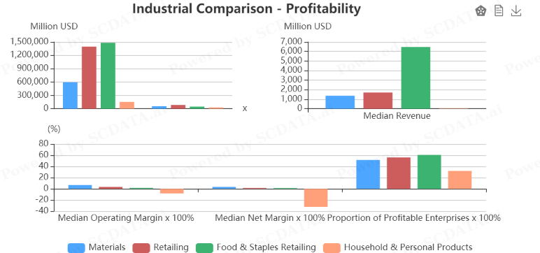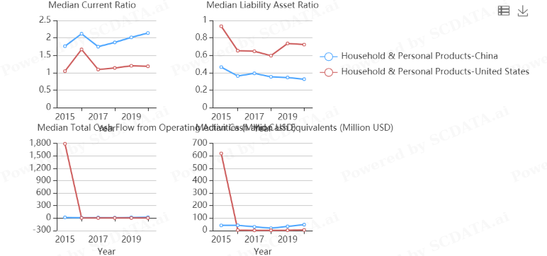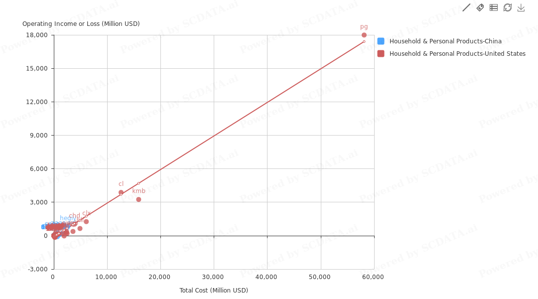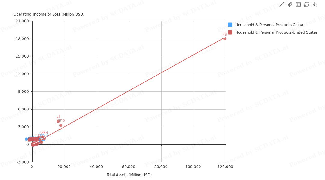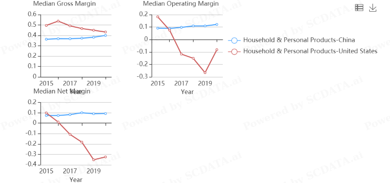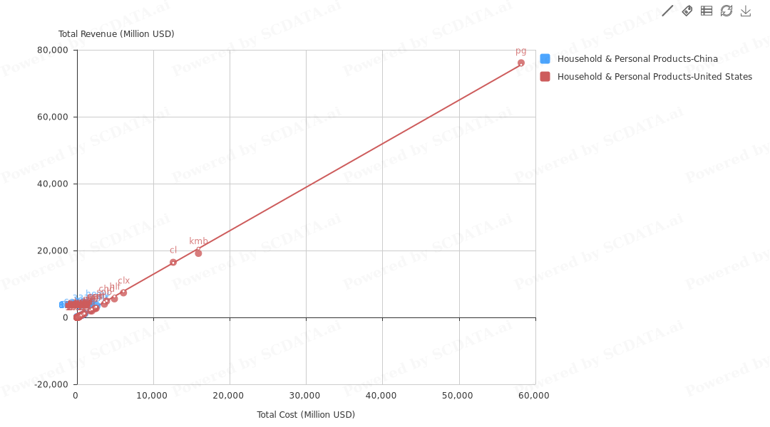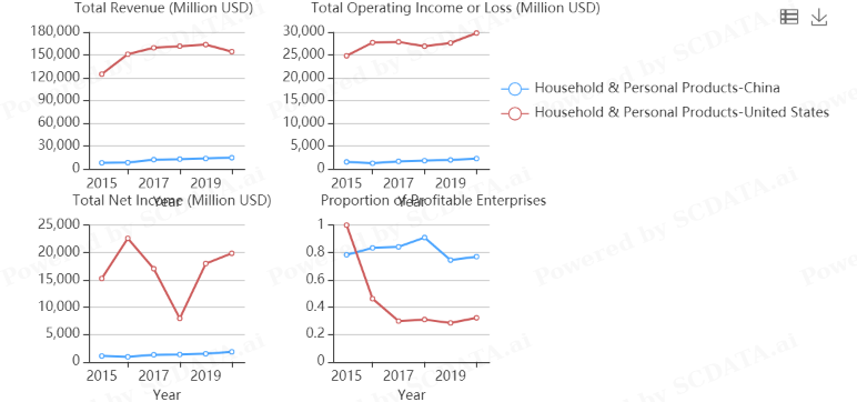 In the Household & Personal Products industry, China is much smaller than the United States. P&G in the U.S. is the largest company, followed by Kimberly-Clark in the analysis, whose total revenue is slightly below average. Colgate and Clorox are basically on the average.