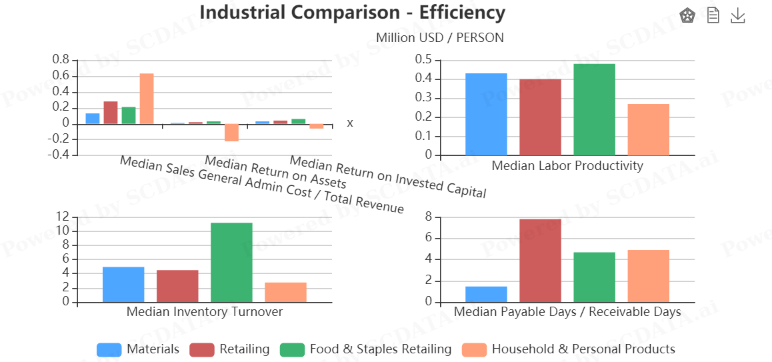 Household & Personal Products has the high admin cost/ total revenue, but low ROA. Moreover, Household & Personal Products industry has low Inventory turnover, and low labor producitivity.