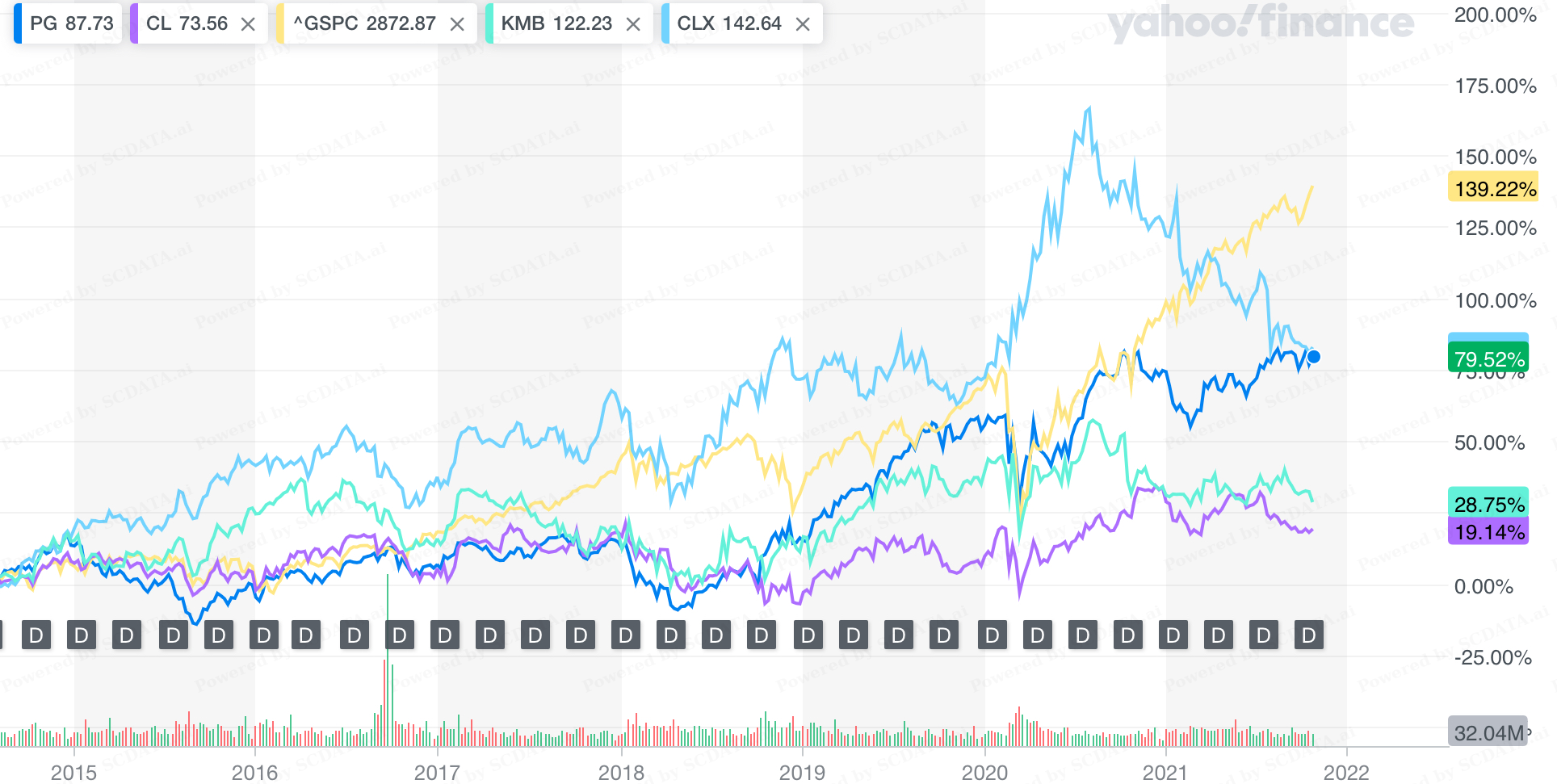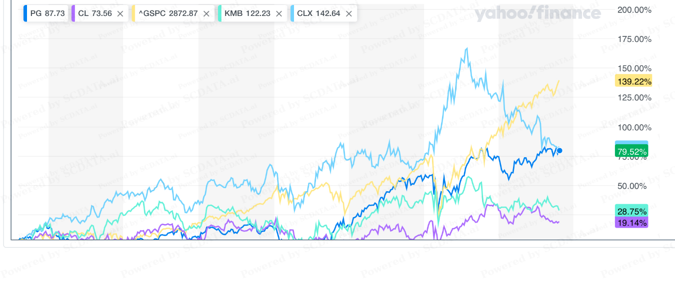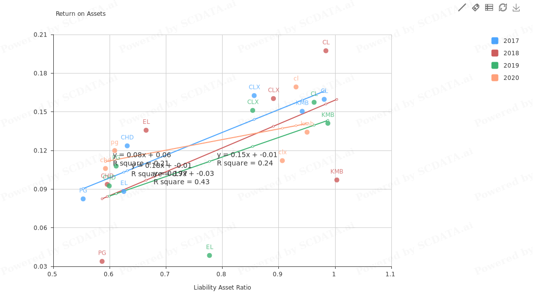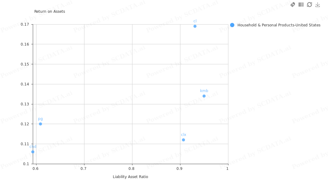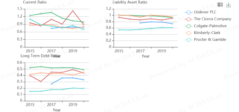 Colgate's ROA is good, but its financial health is not. Kimberley performs better on ROA, but has the largest debt assets of the five, proving that the business has a high level of debt. P&G's financials are healthy but ROA is not high, Clorox is not doing well in both financial health and ROA.(SP500 is used for ease of observation due to the large and uneven distribution of all companies.)