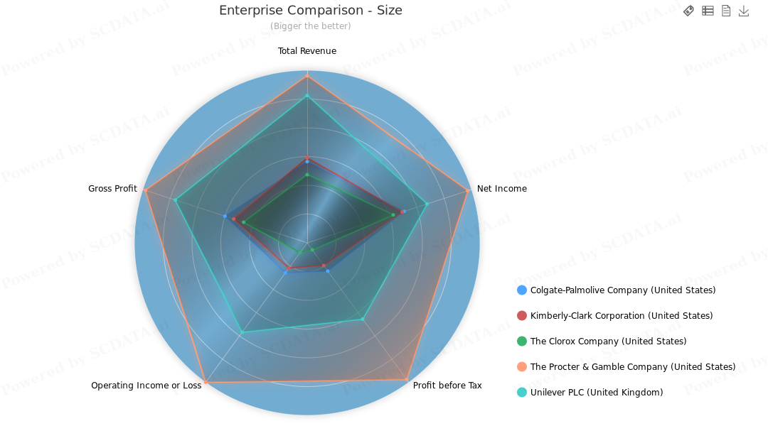 Colgate has fewer assets and is more profitable than Kimberly-Clark. P&G's revenue and assets far exceed those of other companies in the industry.