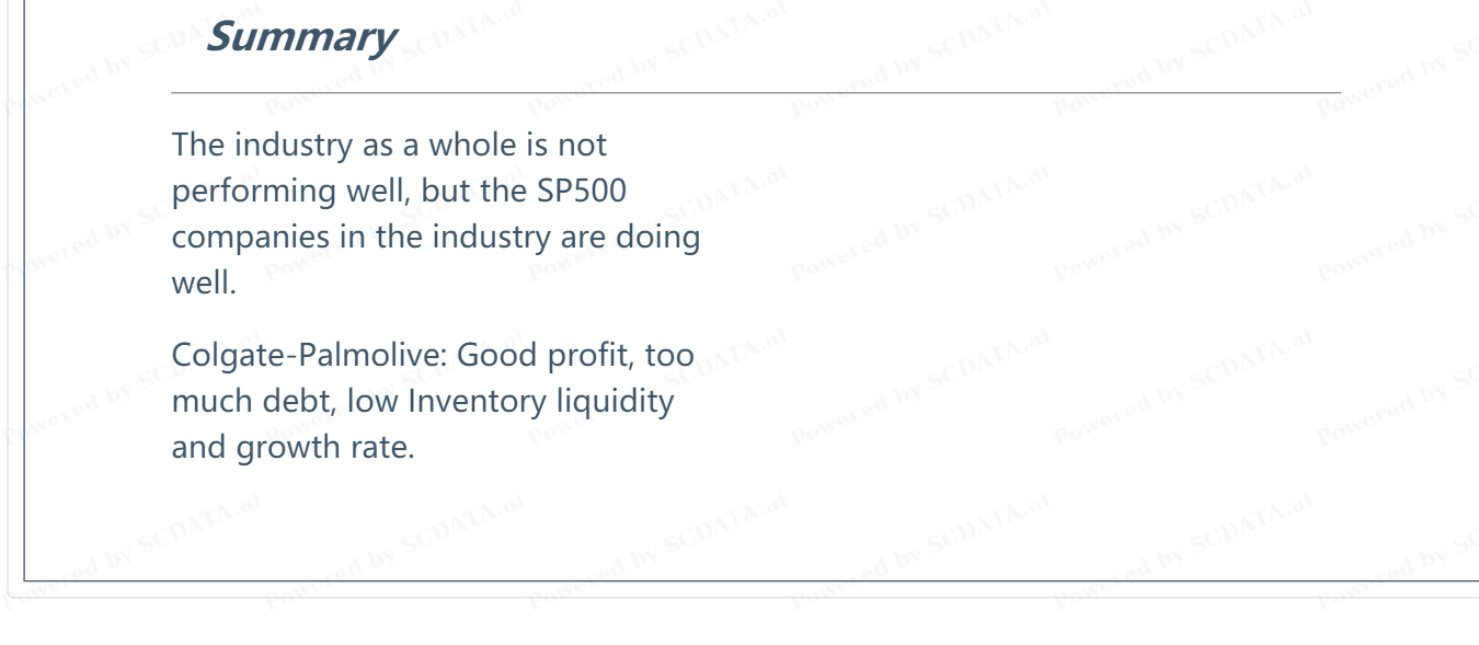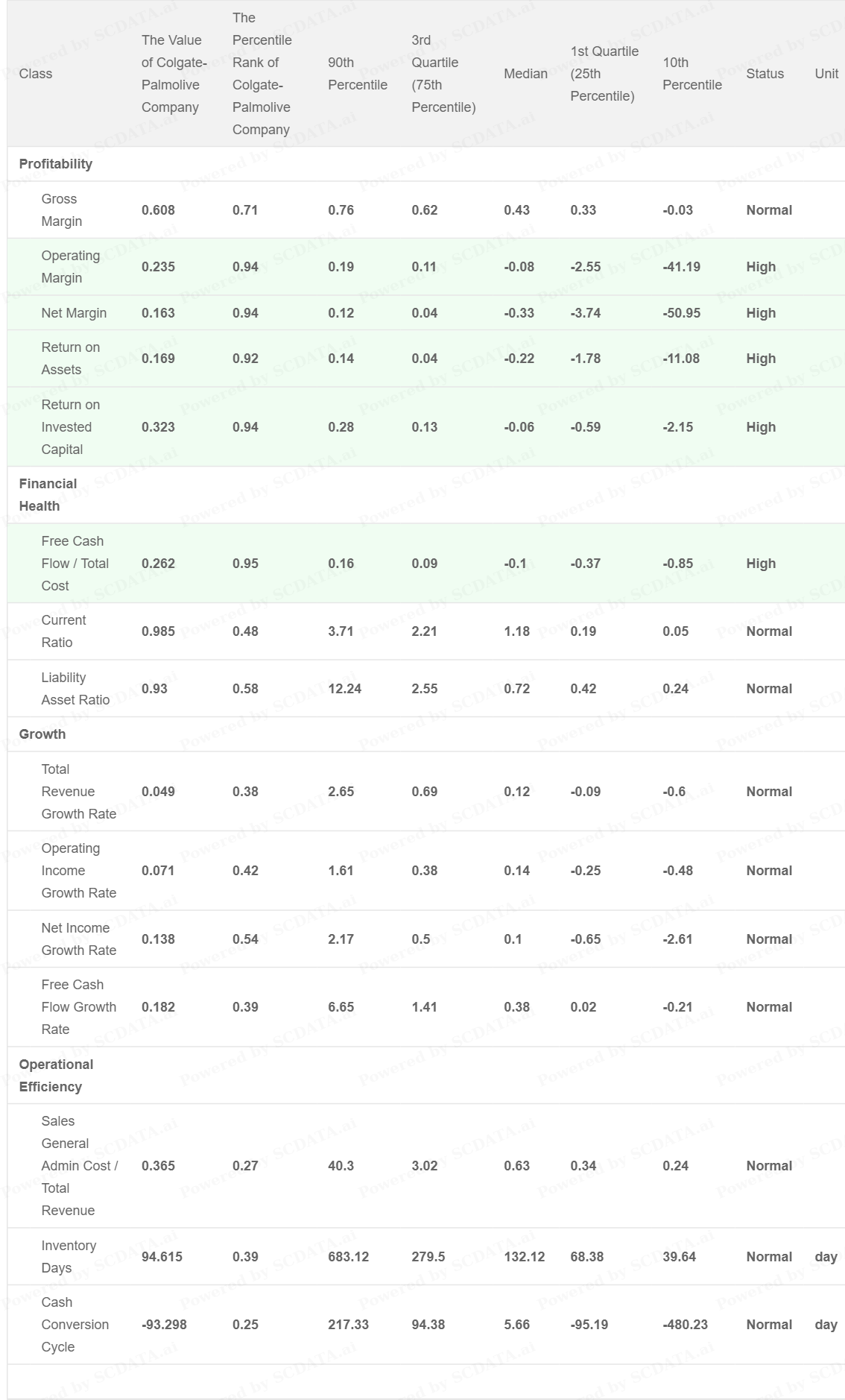 Within the industry as a whole, Colgate-Palmolive has superior profitability and other usual performance, but the industry includes many small loss-making companies. Among companies in the same tier as Colgate-Palmolive, Colgate-Palmolive is underperforming in terms of growth and operating efficiency and theliability weighting in financials.