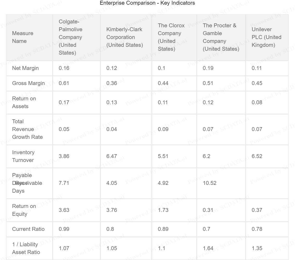 Colgate-Palmolive's total revenue growth rate is 0.05, which is low among its competitors and may be a reason for the lower share price. In addition, Colgate-Palmolive has the lowest inventory turnover rate among its competitors and lacks liquidity. In addition, Colgate-Palmolive has only a little more assets than liabilities and is over-indebted.