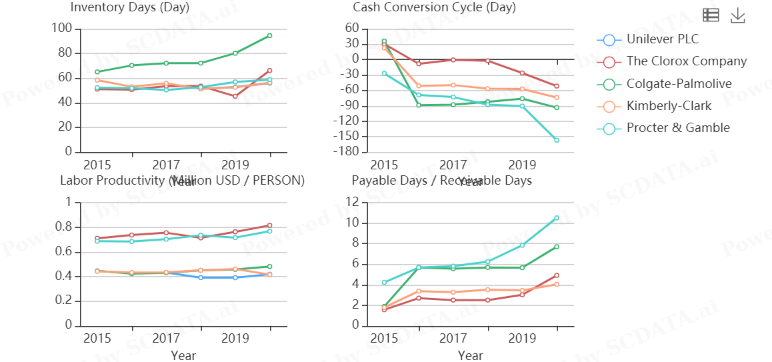 Colgate-Palmolive has much higher inventory days than other competitive companies in the industry, poor inventory liquidity but Colgate has a shorter cash conversion cycle. In addition, Colgate's labor productivity is lower than P&G and Clorox.