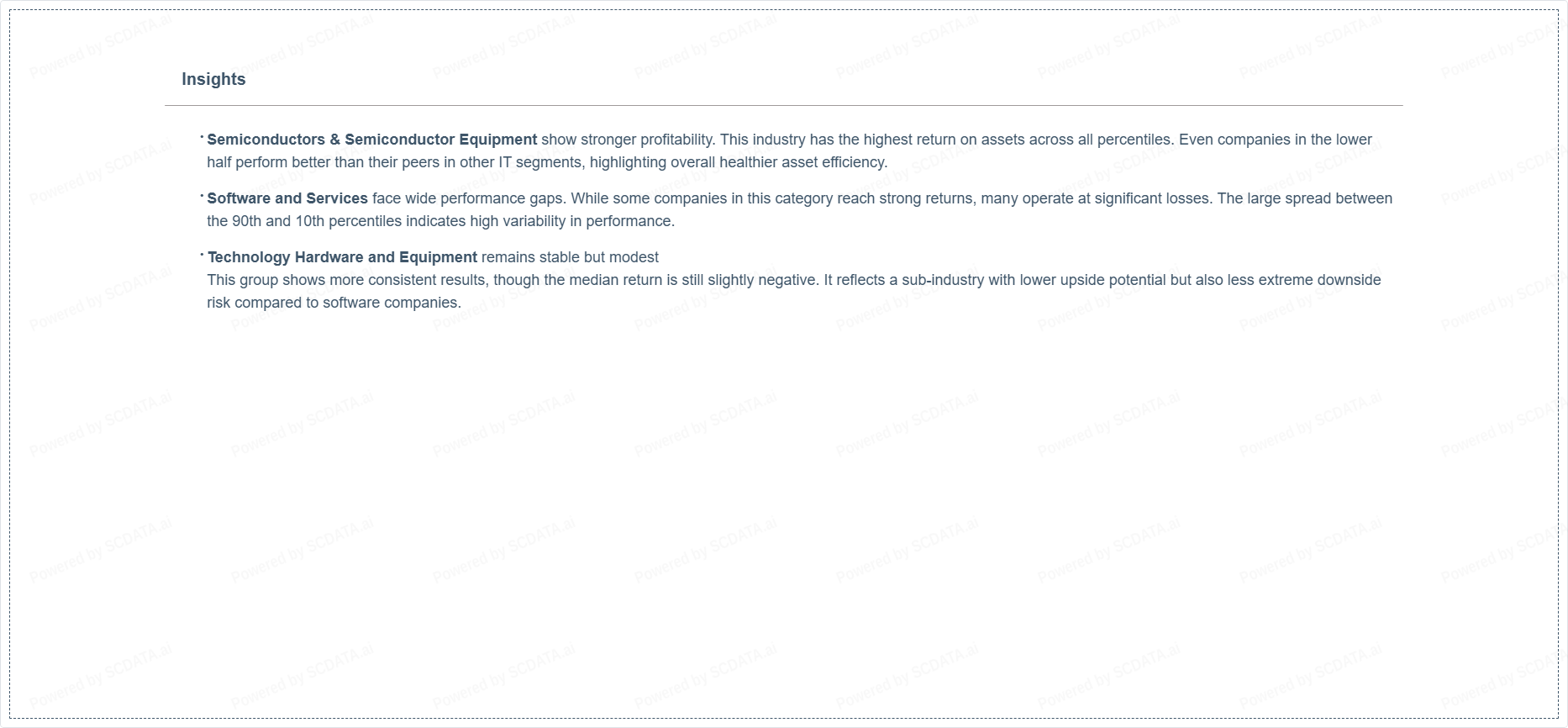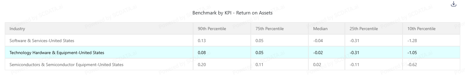 Semiconductors & Semiconductor Equipment show stronger profitability. This industry has the highest return on assets across all percentiles. Even companies in the lower half perform better than their peers in other IT segments, highlighting overall healthier asset efficiency.