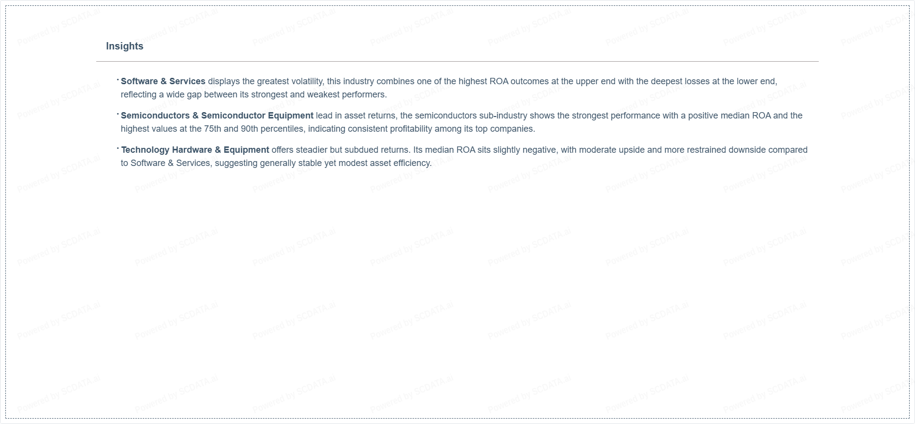 Technology Hardware & Equipment offers steadier but subdued returns. Its median ROA sits slightly negative, with moderate upside and more restrained downside compared to Software & Services, suggesting generally stable yet modest asset efficiency.