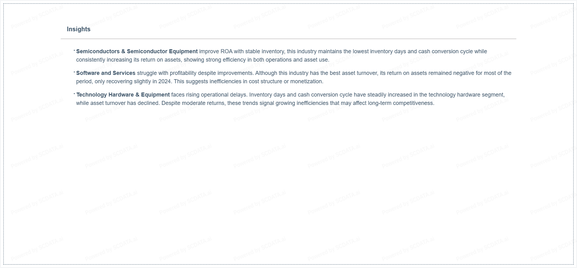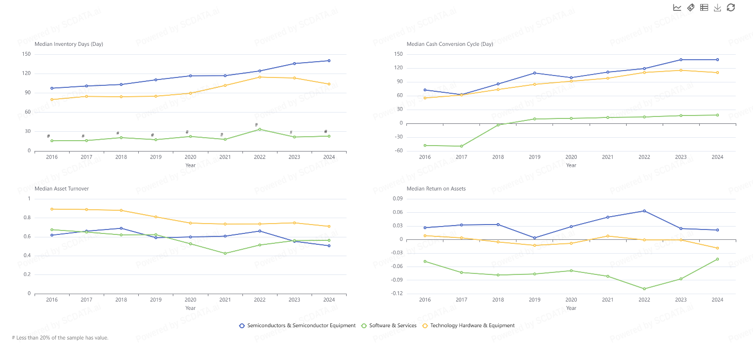Technology Hardware & Equipment faces rising operational delays. Inventory days and cash conversion cycle have steadily increased in the technology hardware segment, while asset turnover has declined. Despite moderate returns, these trends signal growing inefficiencies that may affect long-term competitiveness.