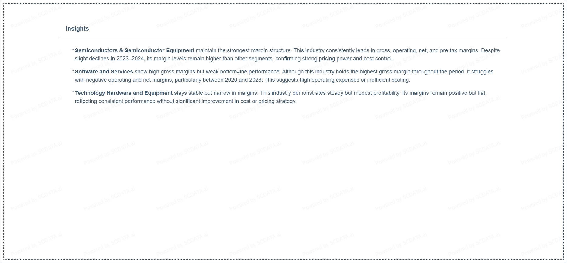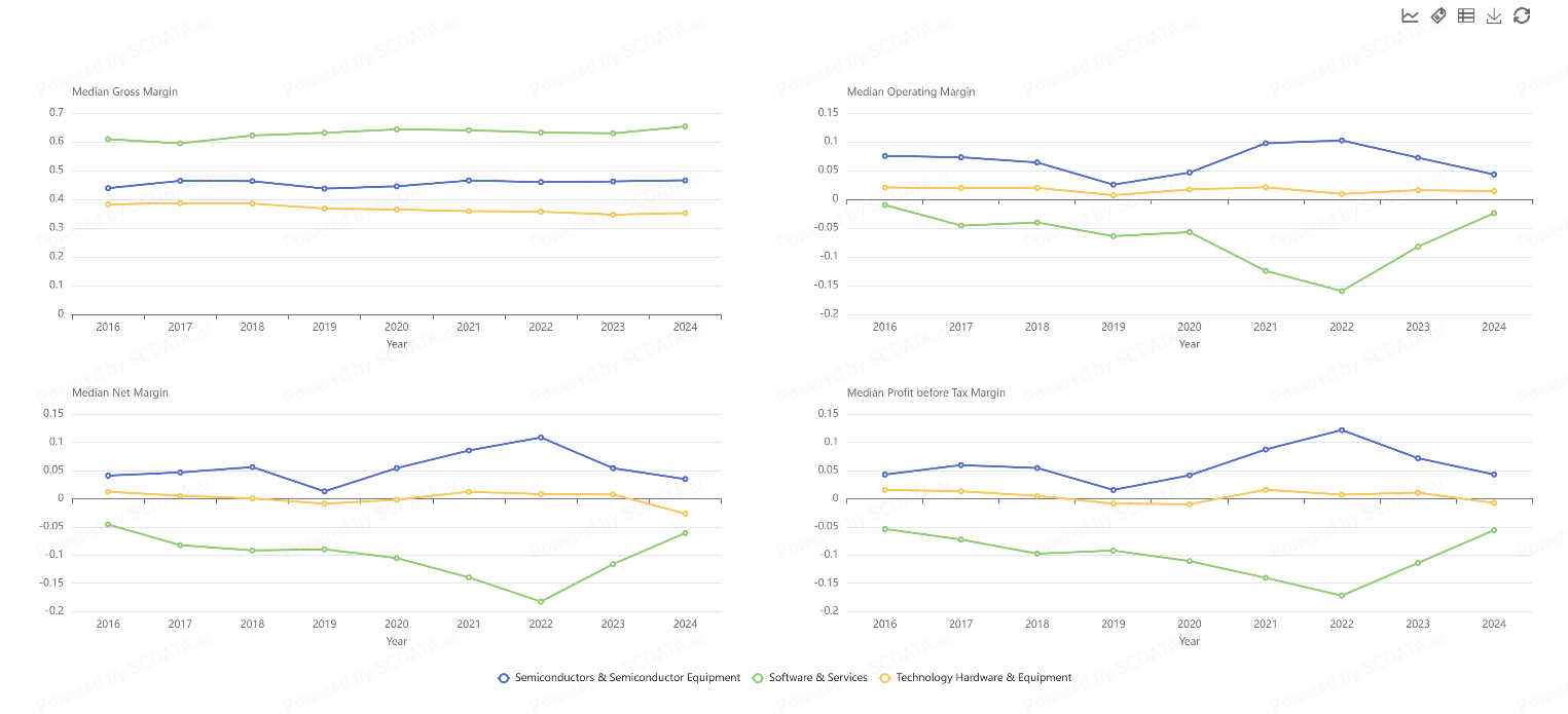 Semiconductors & Semiconductor Equipment maintain the strongest margin structure. This industry consistently leads in gross, operating, net, and pre-tax margins. Despite slight declines in 2023–2024, its margin levels remain higher than other segments, confirming strong pricing power and cost control.