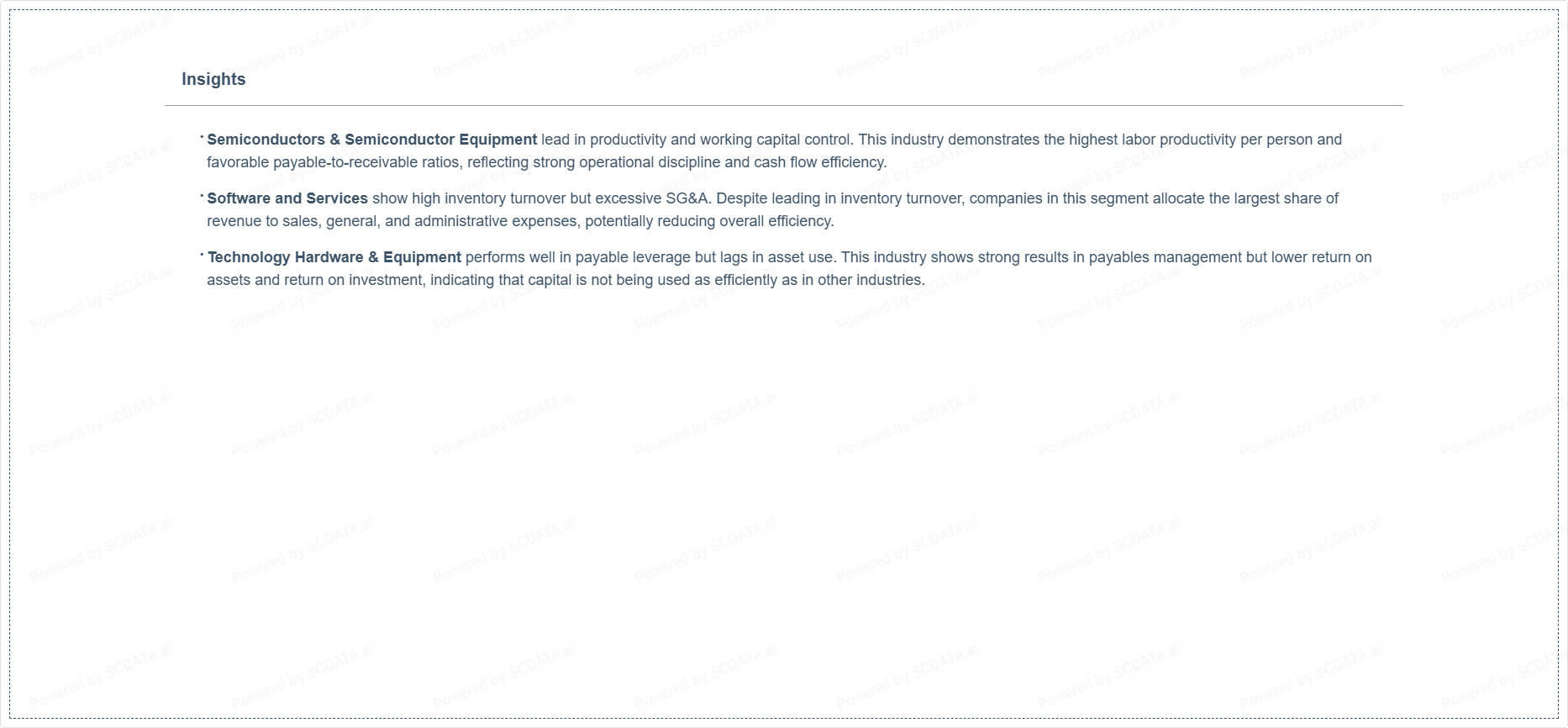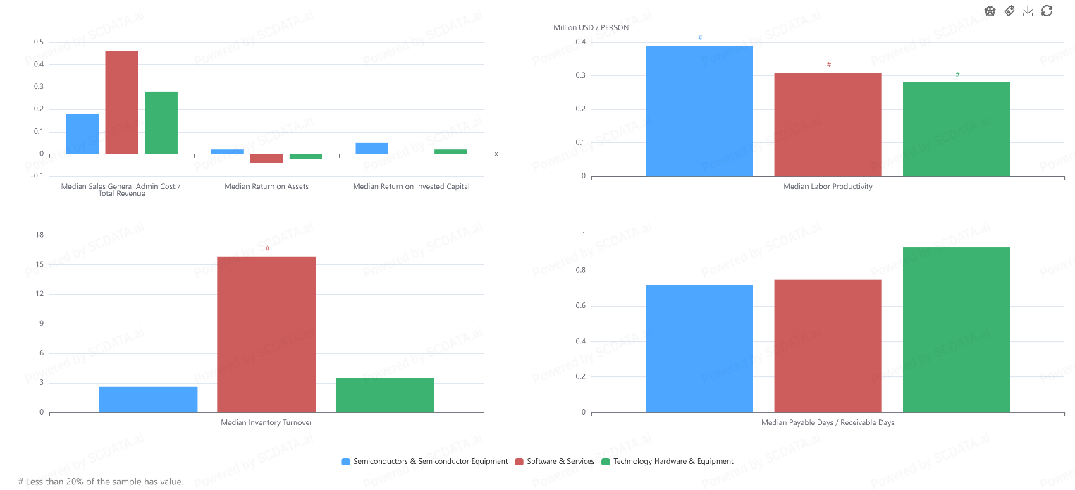 Semiconductors & Semiconductor Equipment lead in productivity and working capital control. This industry demonstrates the highest labor productivity per person and favorable payable-to-receivable ratios, reflecting strong operational discipline and cash flow efficiency.