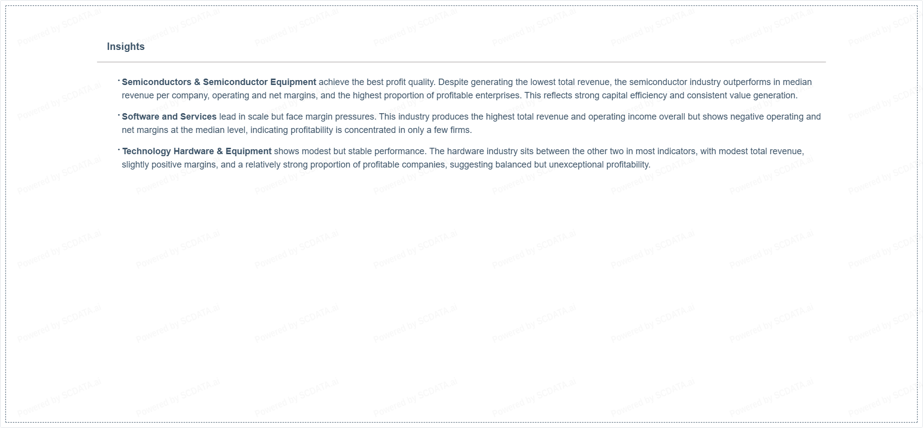 Technology Hardware & Equipment shows modest but stable performance. The hardware industry sits between the other two in most indicators, with modest total revenue, slightly positive margins, and a relatively strong proportion of profitable companies, suggesting balanced but unexceptional profitability.
