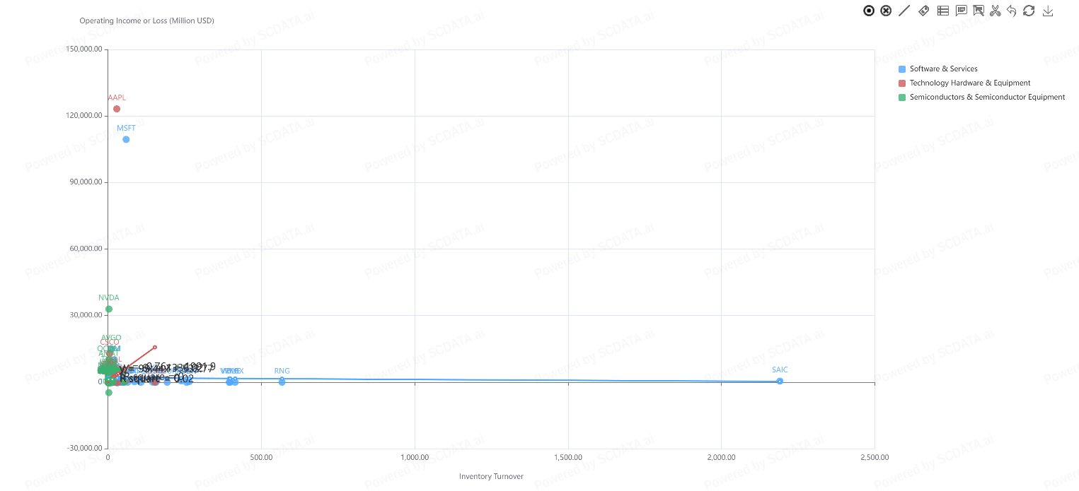 Some companies in the Software & Services industry show exceptionally high inventory turnover, but with very low revenue, suggesting these are niche or low-volume firms with unique models or data anomalies.