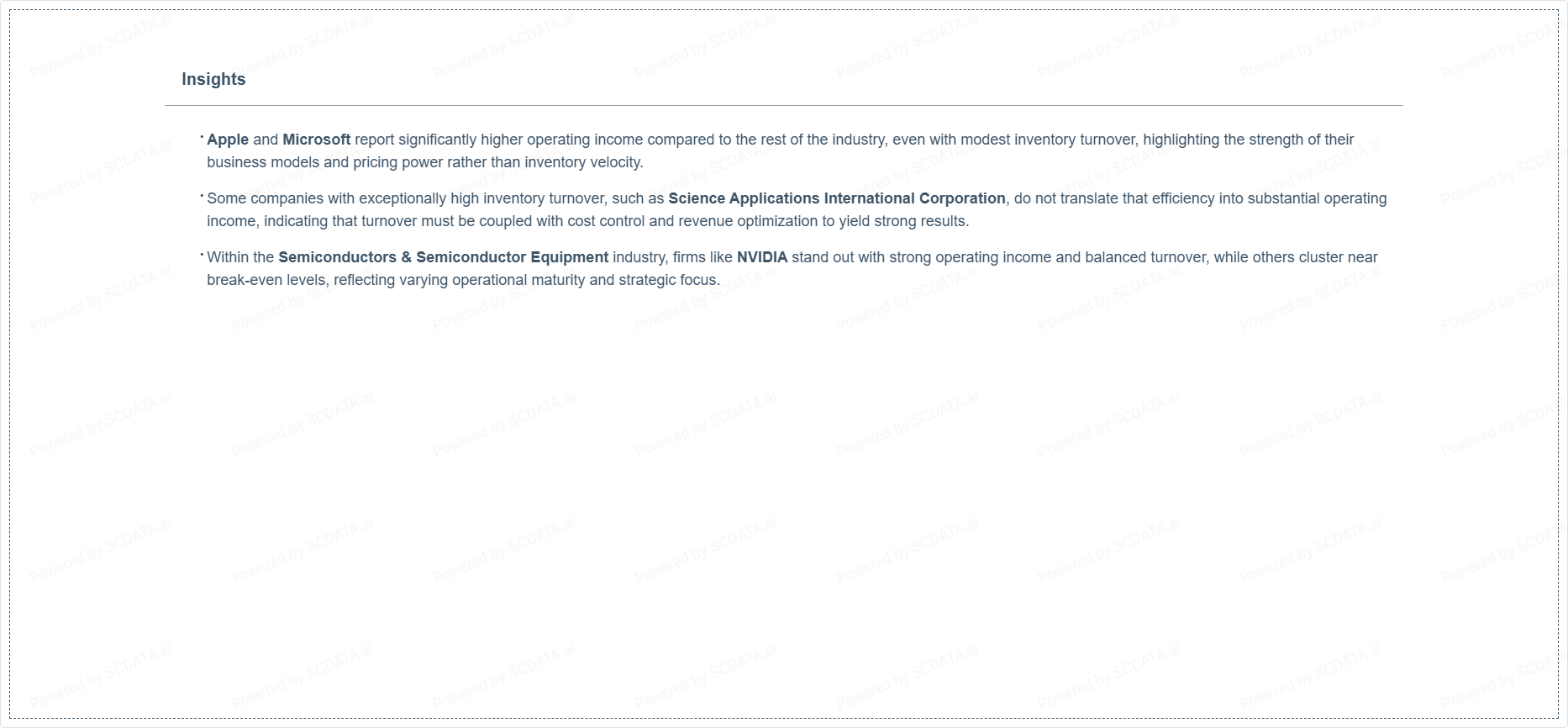 Some companies with exceptionally high inventory turnover, such as Science Applications International Corporation, do not translate that efficiency into substantial operating income, indicating that turnover must be coupled with cost control and revenue optimization to yield strong results.