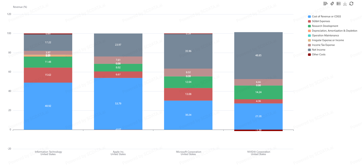 Apple Inc. shows a high share of Cost of Revenue, close to 54%, reflecting its hardware-intensive and manufacturing-heavy business model. Similarly, the average for the Information Technology sector also exceeds 48%, while Microsoft and NVIDIA maintain lower cost proportions, suggesting higher operational efficiency or a focus on high-margin products.