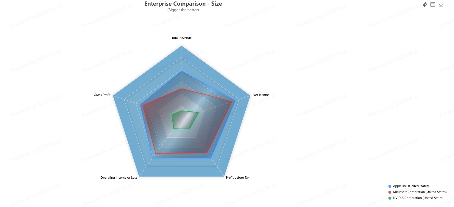 NVIDIA occupies the innermost region, reflecting its relatively smaller size compared to Microsoft and Apple. Despite its strong innovation and profitability, its absolute size is still growing in comparison to the two tech giants.