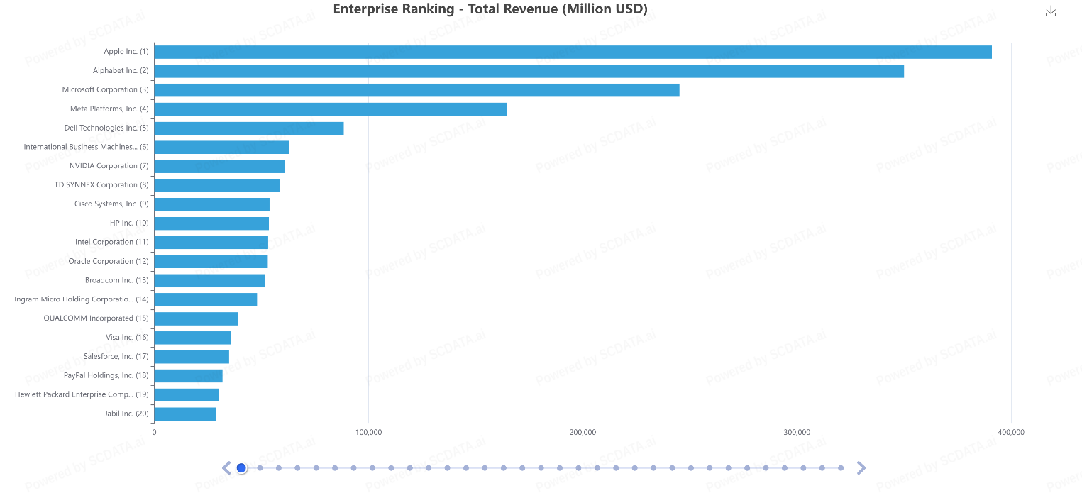 After Dell at position five, revenues fall sharply, with companies ranked six through twenty each generating less than half of Dell’s revenue, illustrating a pronounced gap between the tech giants and mid tier players.