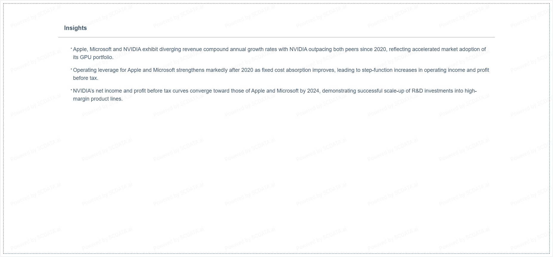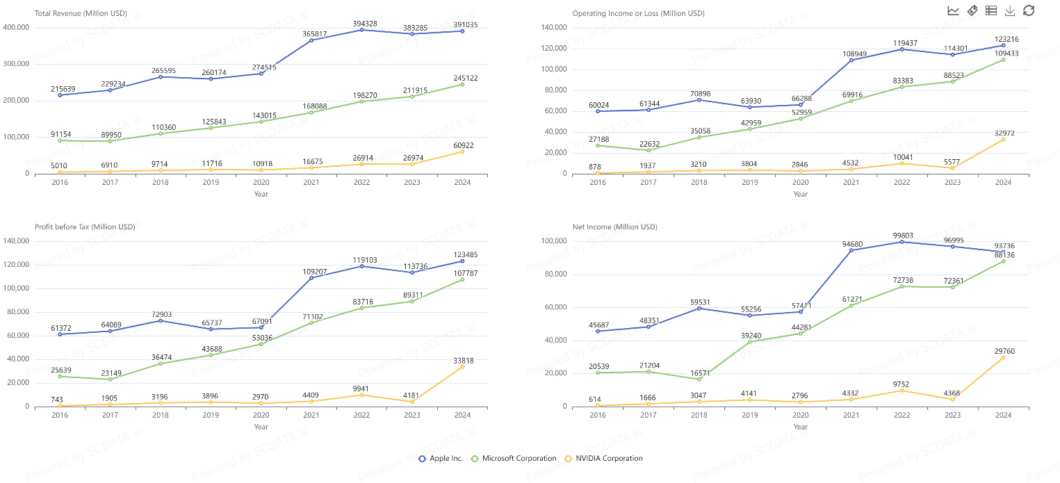 NVIDIA’s net income and profit before tax curves converge toward those of Apple and Microsoft by 2024, demonstrating successful scale-up of R&D investments into high-margin product lines.