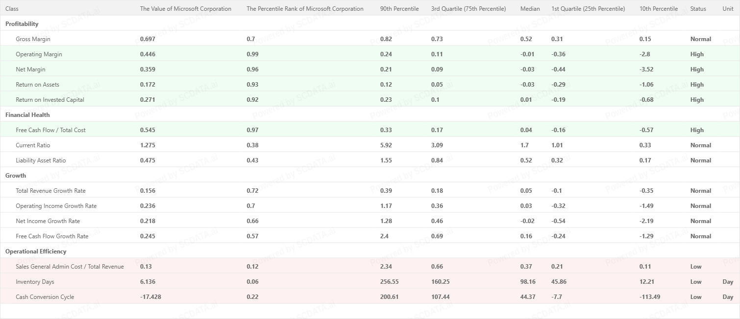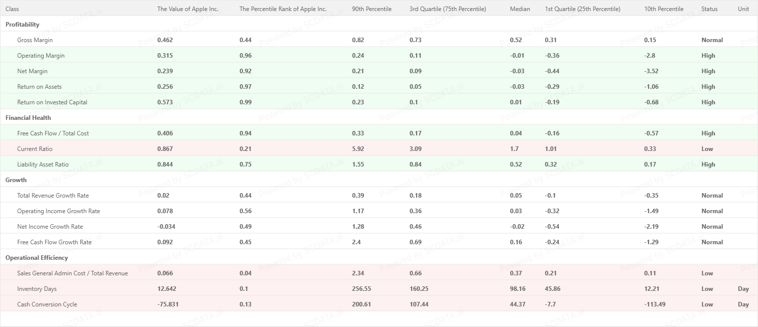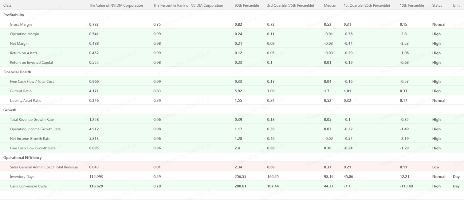 NVIDIA and Microsoft rank in the 98th–99th percentiles for operating, net and asset returns, whereas Apple’s profitability metrics cluster around the 95th–97th percentiles. This confirms NVIDIA’s and Microsoft’s superior margin conversion and capital efficiency.