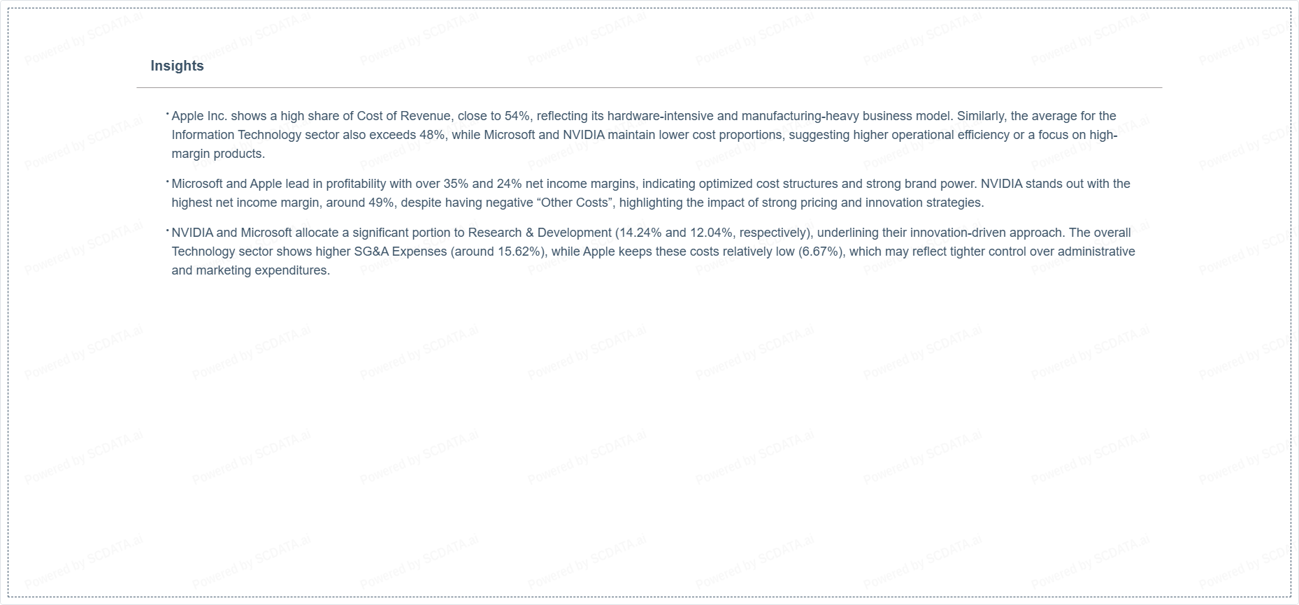 NVIDIA and Microsoft allocate a significant portion to Research & Development (14.24% and 12.04%, respectively), underlining their innovation-driven approach. The overall Technology sector shows higher SG&A Expenses (around 15.62%), while Apple keeps these costs relatively low (6.67%), which may reflect tighter control over administrative and marketing expenditures.