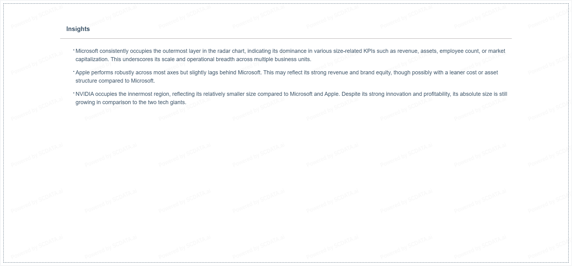 Microsoft consistently occupies the outermost layer in the radar chart, indicating its dominance in various size-related KPIs such as revenue, assets, employee count, or market capitalization. This underscores its scale and operational breadth across multiple business units.