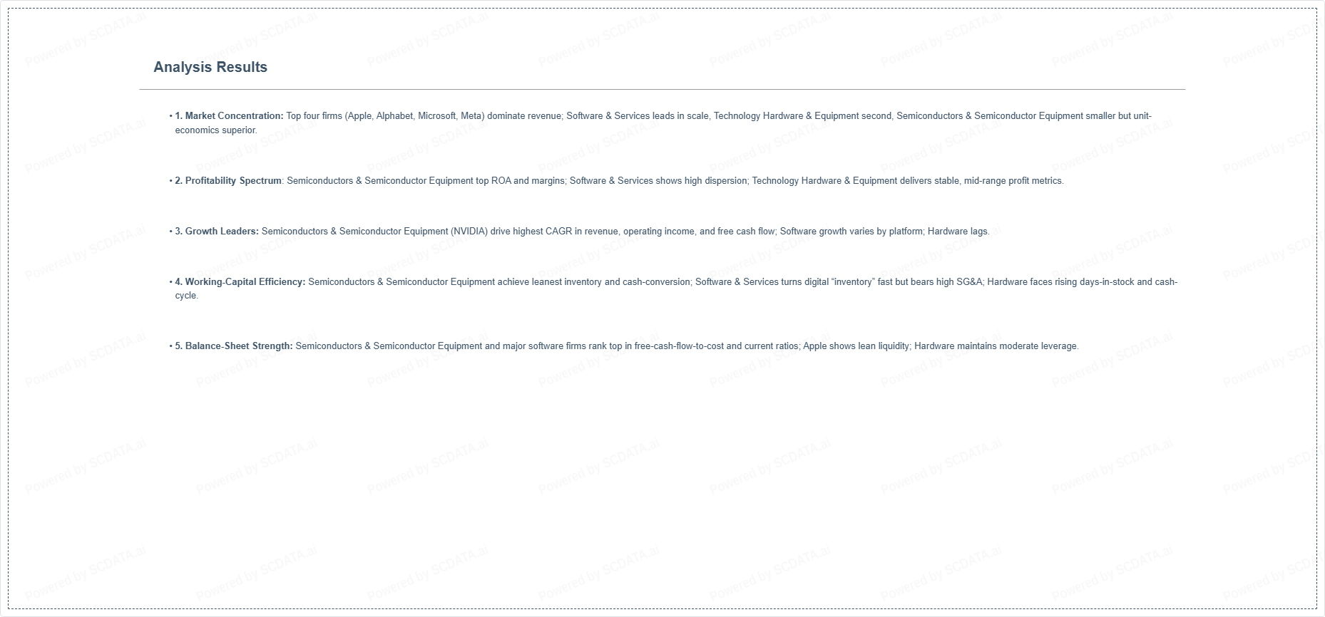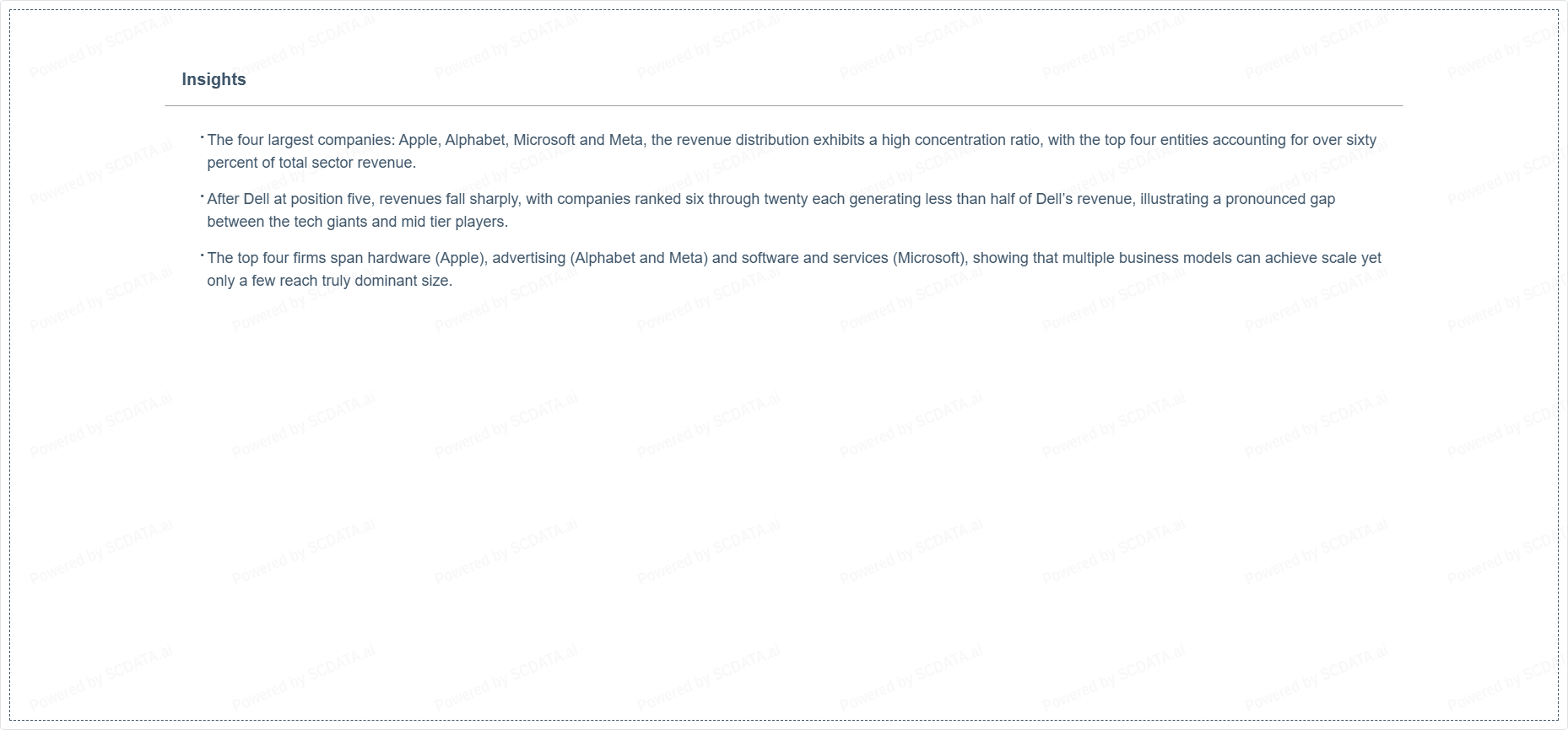The four largest companies: Apple, Alphabet, Microsoft and Meta, the revenue distribution exhibits a high concentration ratio, with the top four entities accounting for over sixty percent of total sector revenue.