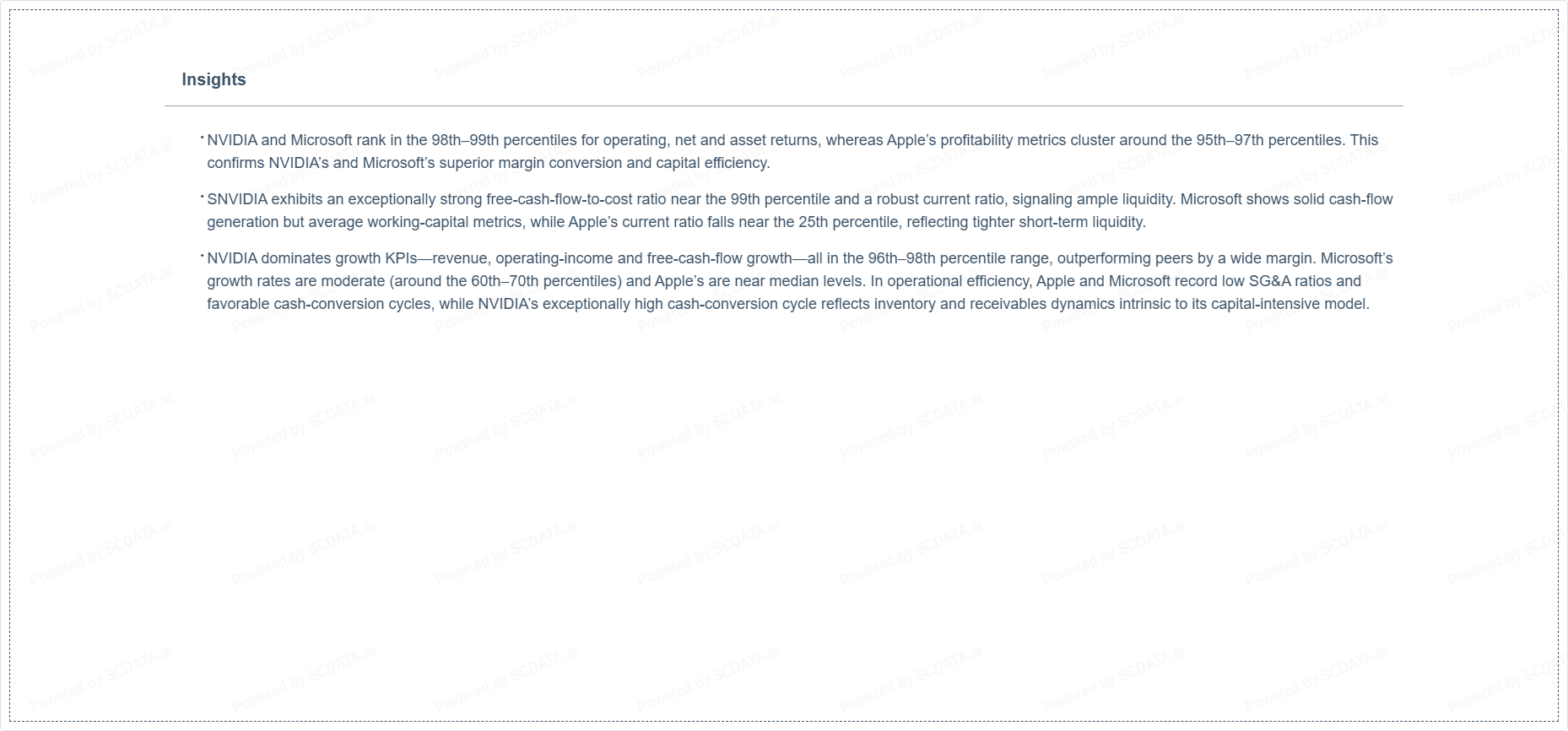 NVIDIA dominates growth KPIs—revenue, operating-income and free-cash-flow growth—all in the 96th–98th percentile range, outperforming peers by a wide margin. Microsoft’s growth rates are moderate (around the 60th–70th percentiles) and Apple’s are near median levels. In operational efficiency, Apple and Microsoft record low SG&A ratios and favorable cash-conversion cycles, while NVIDIA’s exceptionally high cash-conversion cycle reflects inventory and receivables dynamics intrinsic to its capital-intensive model.
