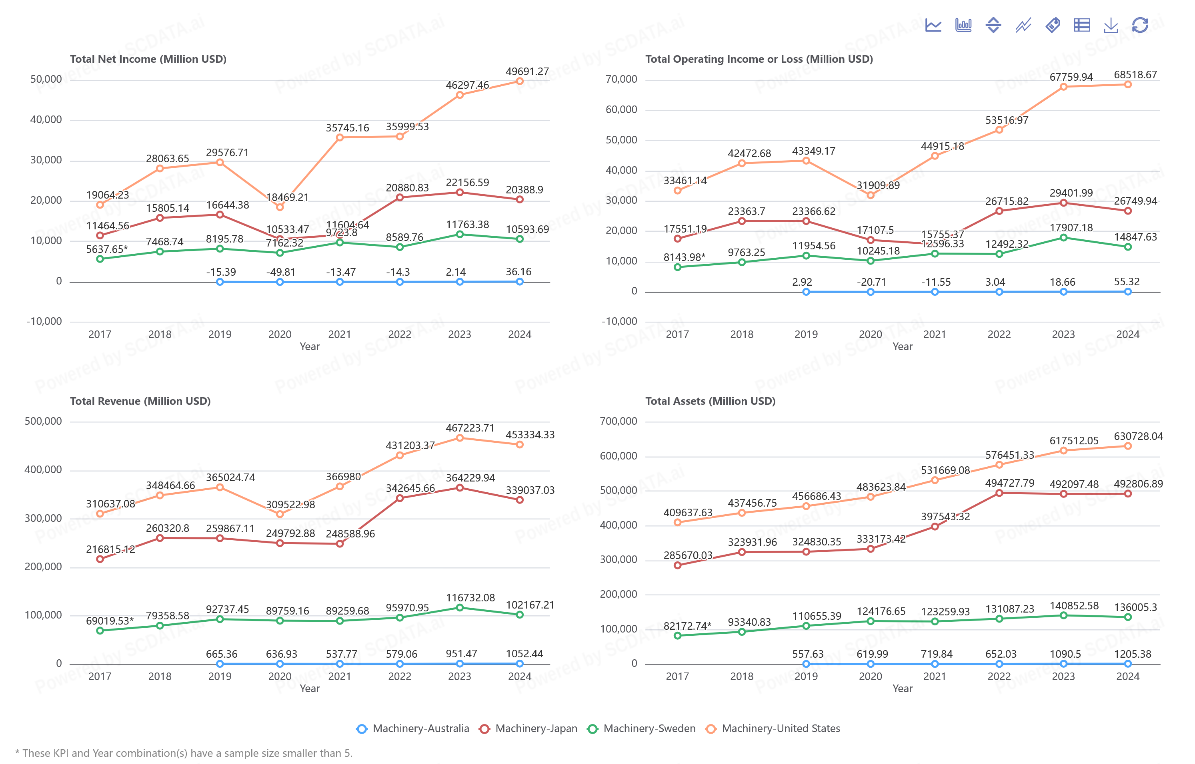 Australia appears to be the smallest of the four markets, with consistently low revenue, profit, and asset values. These muted lines indicate a small, niche machinery sector with more limited supplier depth and fewer large‑scale manufacturing capabilities.