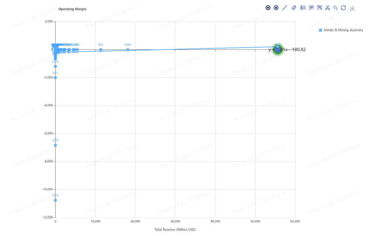 This scatter plot compares Operating Margin against Total Revenue for Australian Mining companies. Most firms appear in the lower‑left cluster, showing revenues under $10 B and operating margins close to zero, with several sitting slightly negative. A few mid‑tier names, like BSL and FMG, appear at higher revenue levels but still hold modest margins. Only one group of companies reaches the far‑right side, around $55–60 B in revenue, and these points show margins very close to the industry trendline, which lies near 0% (the line labelled y = 0.01x – 190.82). This pattern indicates that in this sector, as revenue grows, margins do not rise in proportion; large companies remain high‑revenue but low‑margin operations.