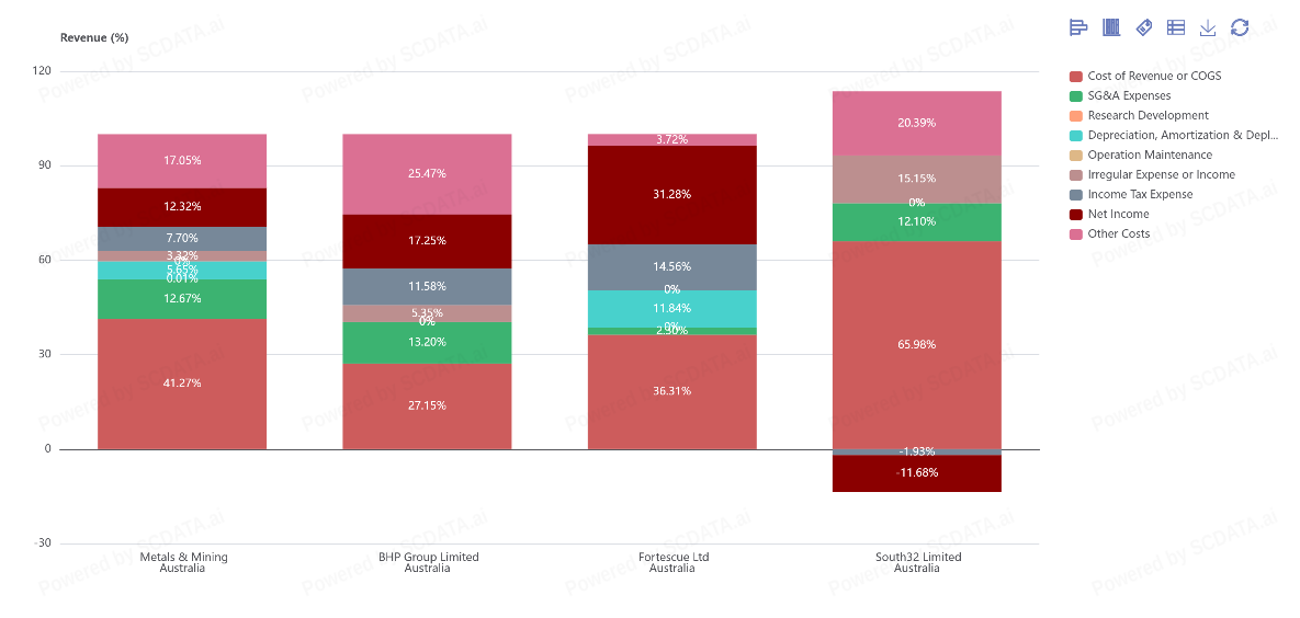 BHP Group’s profile is more balanced, with a smaller COGS share than the industry, a visible SG&A and depreciation layer, and a stronger net‑income band, signalling better cost control and healthier profitability compared to the broader sector. Fortescue shows a notably higher COGS share, paired with a tight overhead structure, resulting in a medium‑sized profit layer, reflecting its more concentrated iron‑ore exposure and sensitivity to production and freight costs. South32, in contrast, displays a very large COGS slice (well above 60%) and a slim net‑income band, indicating much heavier cost pressure and more limited profit room relative to the others.